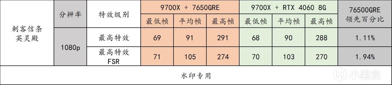 ▲ 刺客信條英靈殿已經實裝了 FSR 優化,分別對比開啓 FSR 前後 7650GRE 與 RTX4060 8G 的 benchmark 表現。開啓 FSR 前,7650GRE 領先 RTX 4060 1.11% 的幅度。