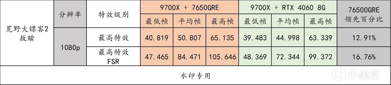 ▲ 荒野大鏢客 2 救贖也支持 FSR 啦,通過 benchmark 實測,普通模式最高特效 1080p 分辨率下,7650GRE 領先 RTX 4060 12.91%,在開啓 FSR 後,7650GRE 領先 RTX 4060 16.76 % ,領先幅度擴大。