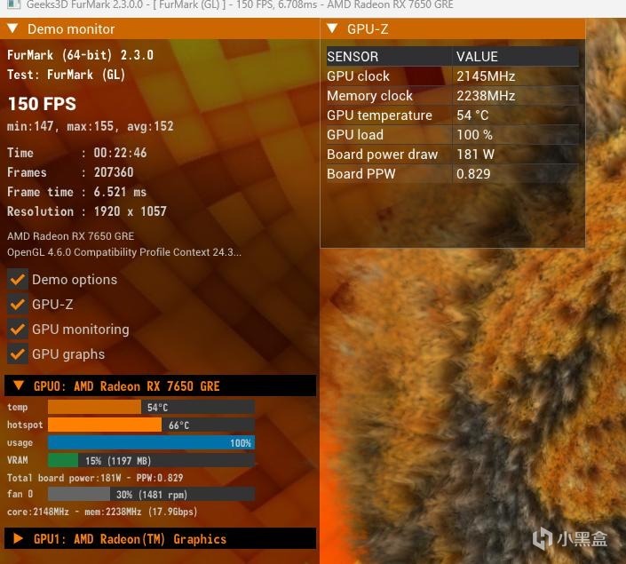 ▲ Furmark 顯卡滿載測試,經過 22 分鐘後,GPU 最高溫度僅爲 54 ℃,顯卡的滿載功耗爲 181W