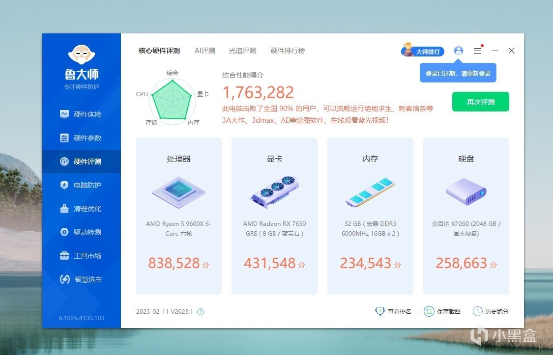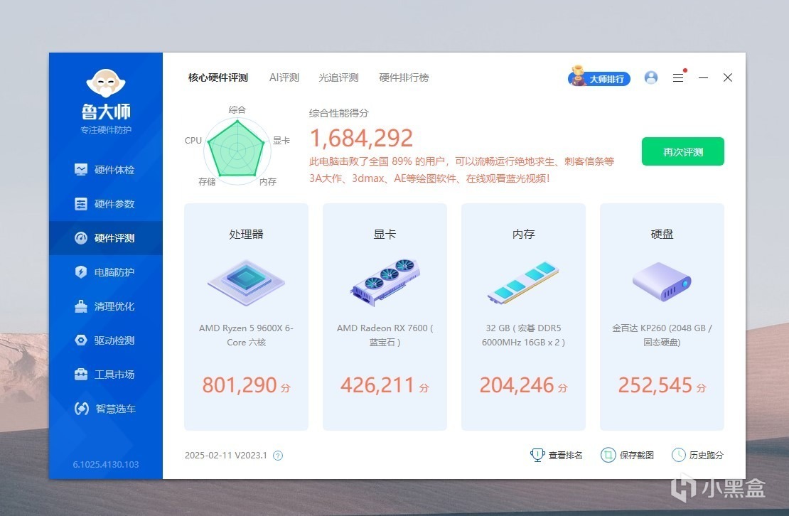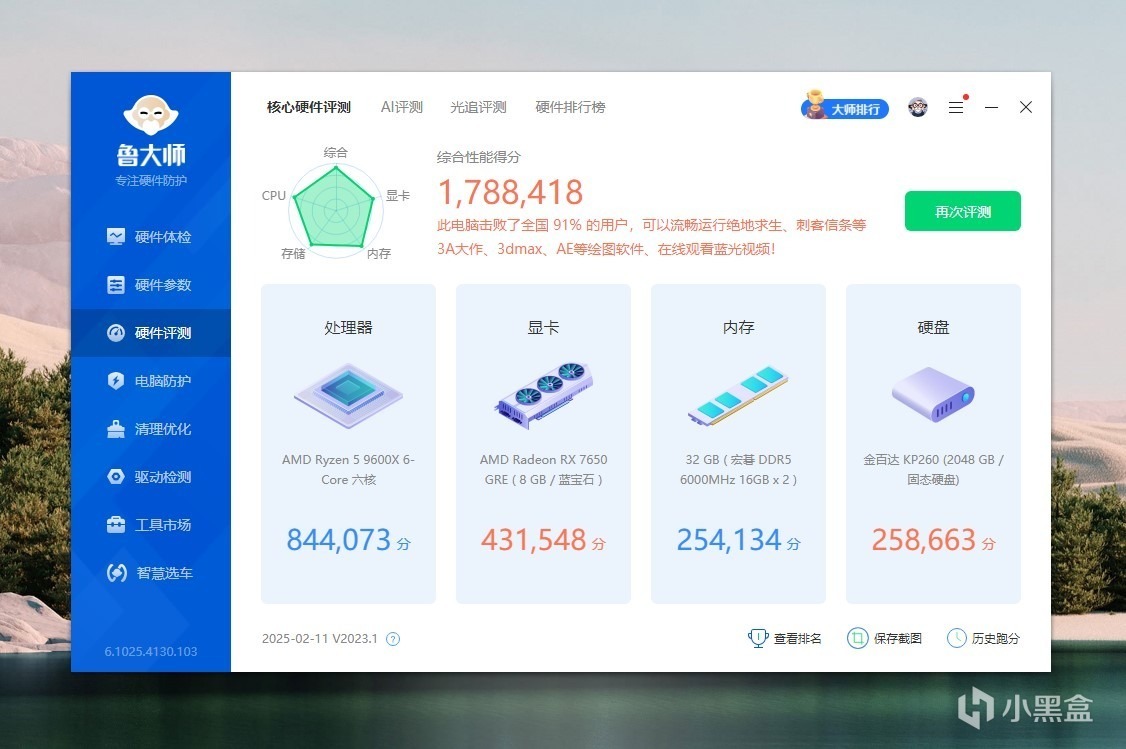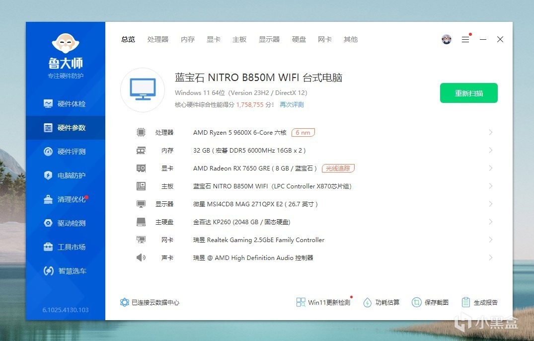 運行下魯大師來看看配置,上面寫着藍寶石NITRO B850M WIFI臺式電腦,CPU是AMD R5 9600X,內存是一對超低時序CL28的宏碁內存,顯卡顯示爲藍寶石RX 7650 GRE,這是藍寶石的新品顯卡,與這款主板同時發佈。它的表現非常不錯,關於這款顯卡的細節,可參考我的另外一篇首發評測文章。