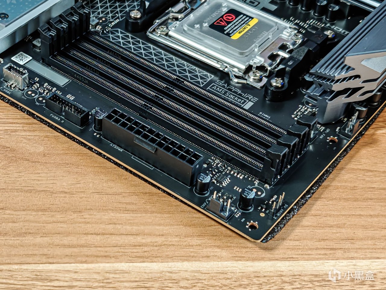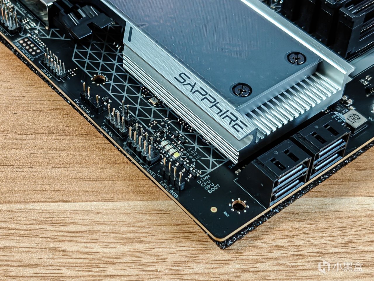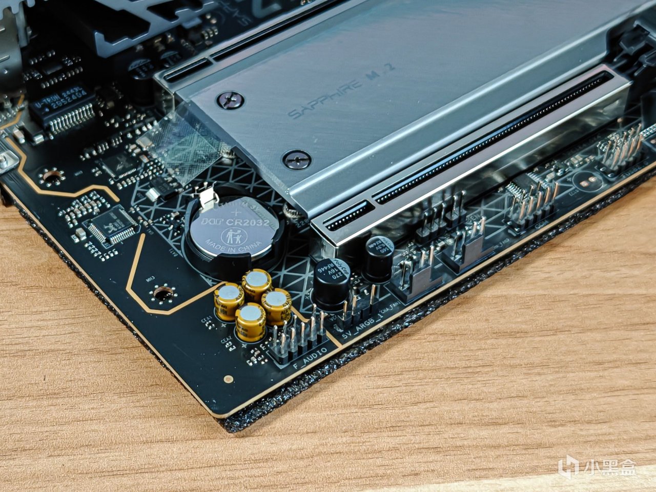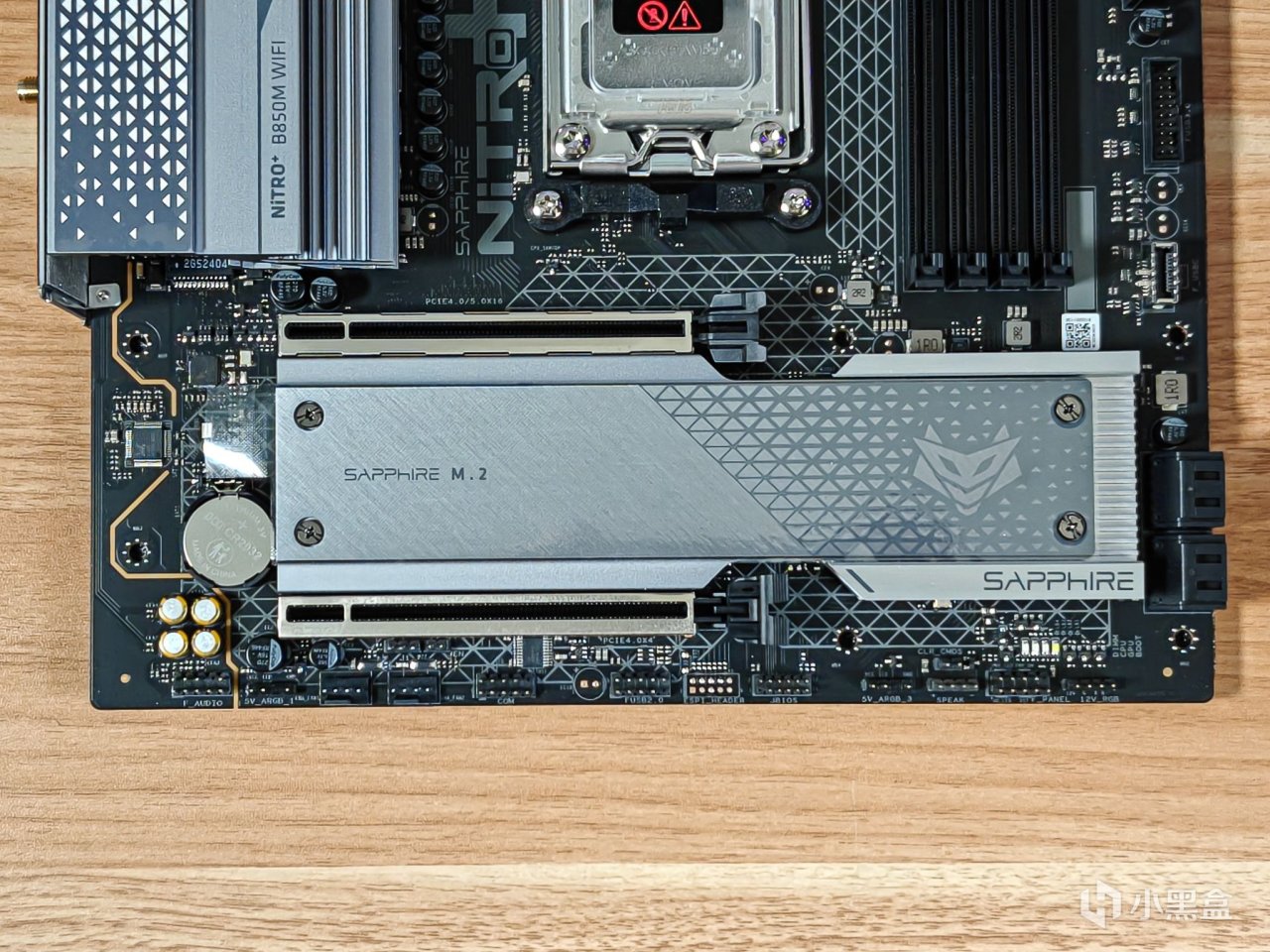主板有2個PCIE插槽,均有金屬加固,用起來讓人放心。第一個支持PCIE 5.0x16,50系顯卡毫無壓力。第二個支持PCIE 4.0x4,可以駁接各種PICE轉接設備,很少看見有給第二個槽加固的。PCIe槽採用了第一槽設計,這樣在使用小機箱的時候,下面依舊有空間安裝風扇。M.2插槽上面是一整片的散熱馬甲,覆蓋到了南橋上面,非常好看。