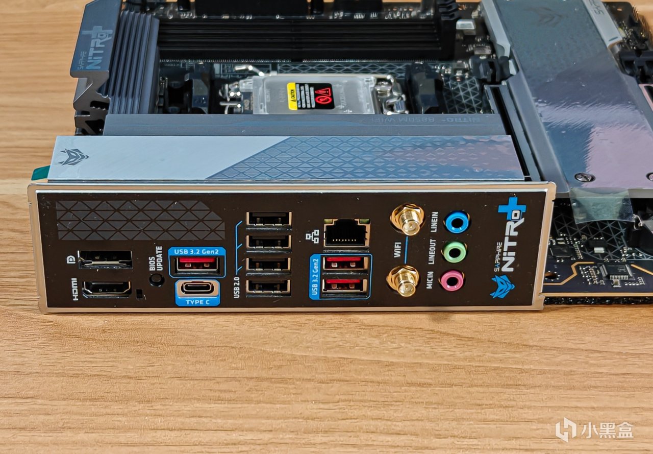 一體式IO採用不鏽鋼邊框,ESD靜電防護,接口豐富。從左到右,有一個板載DP接口和一個板載HDMI接口,一個板刷BIOS按鈕,3個紅色的USB 3.2 GEN 2 10Gbps速率 的Type-A接口,1個USB 3.2 GEN 2 10Gbps 速率的Type-C接口。四個USB 2.0接口排成一列。一個2.5G有線網絡接口,2個WiFi天線接口,板載無線芯片支持Wi-Fi 6,然後是3個音響接口,LINE IN、LINE OUT、MIC IN。