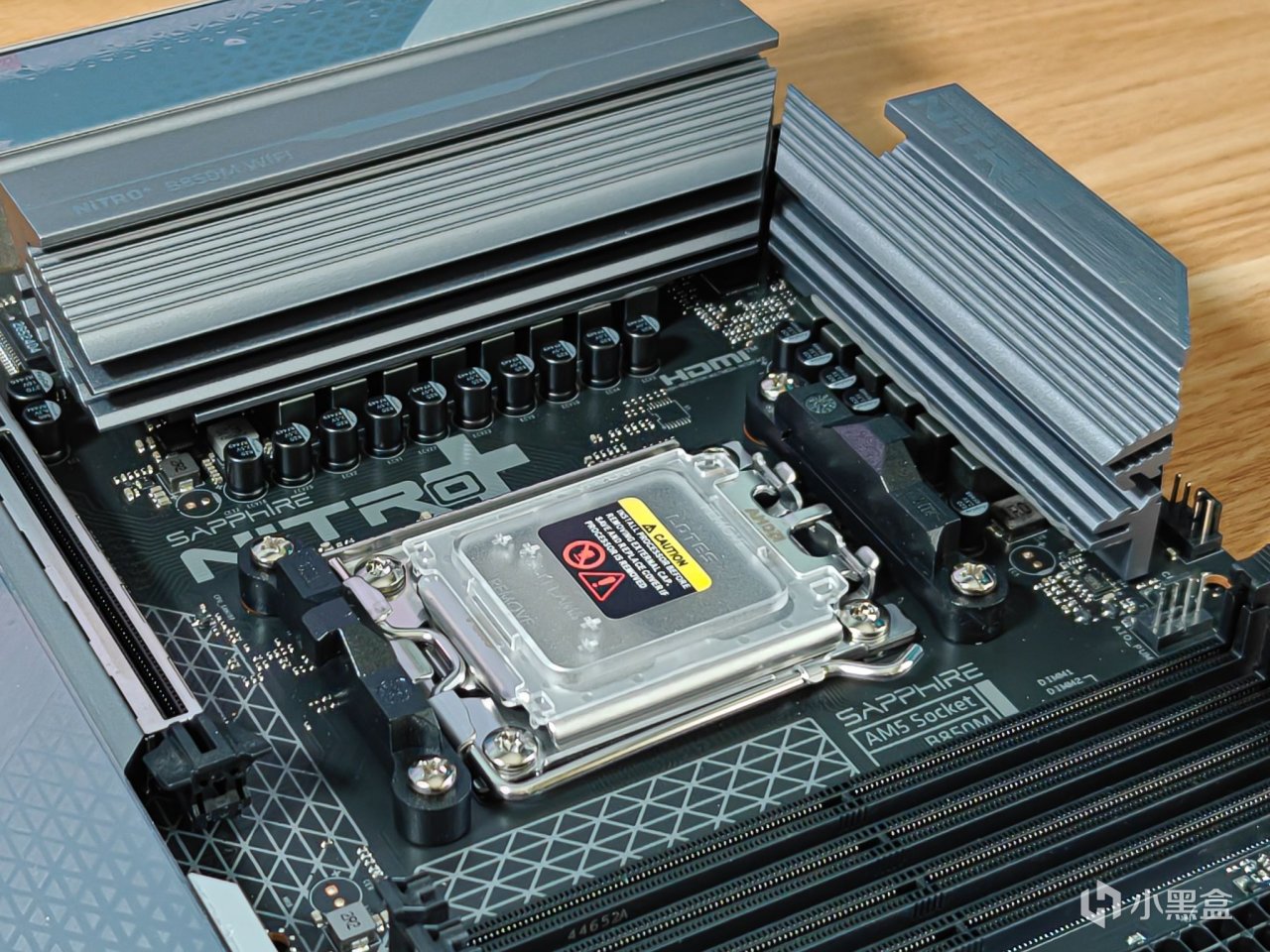 取出主板,這藍寶石NiTRO+ 氮動B850M WIFI主板是標準M-ATX規格的,主板是黑色底色,同時一體式IO、大型VRM散熱裝甲以及M.2散熱裝甲上面佈滿了氮動系列獨特的色彩和圖案,閃耀着金屬的質感。漸變的網狀條紋和上面藍寶石的徽記,散發出獨特的氣息,同常見的黑色或者白色相比,這種獨特的青色讓人眼前一亮。