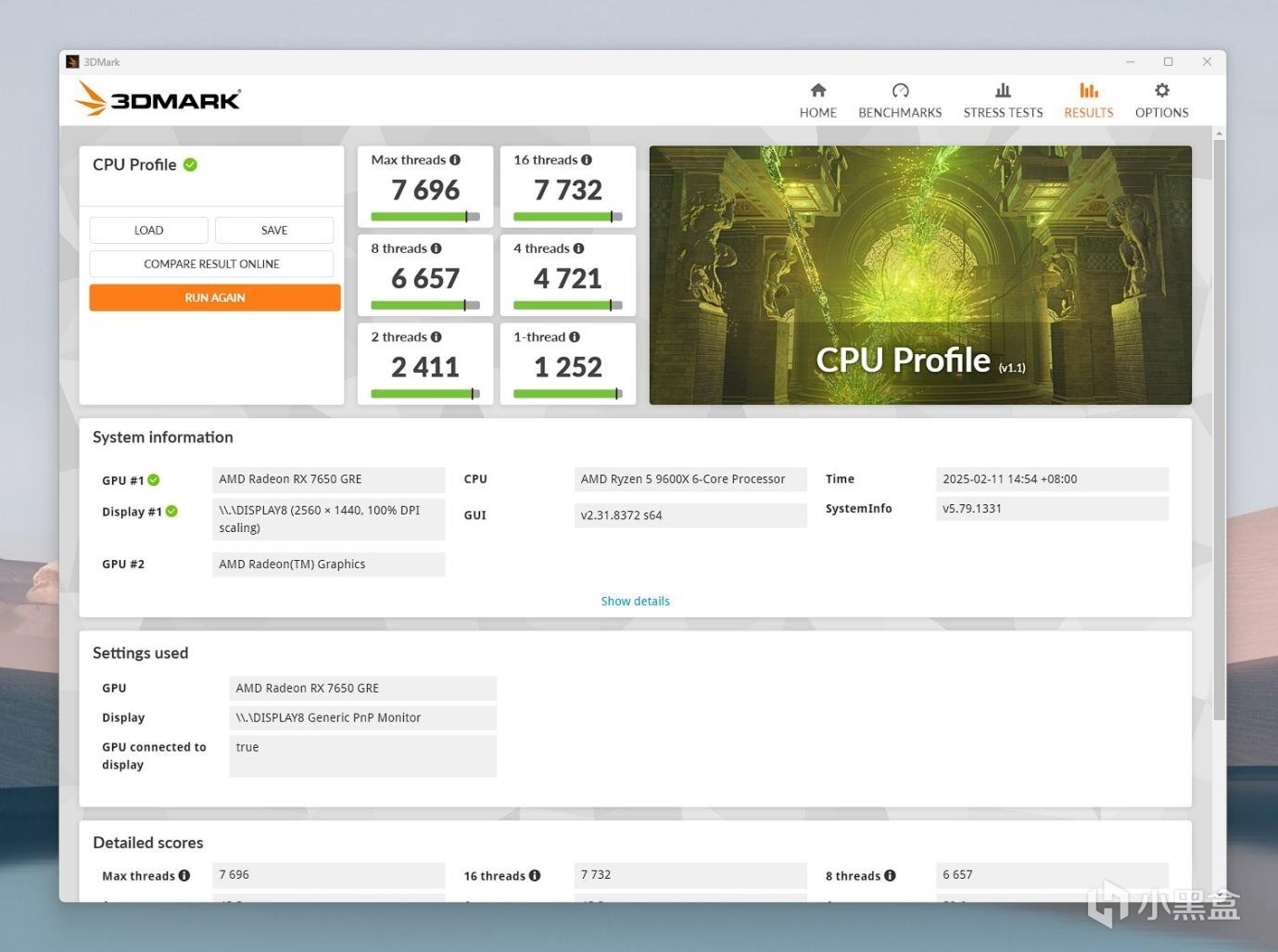 3DMARK CPU Profile測試,單線程1252,最大線程7696。