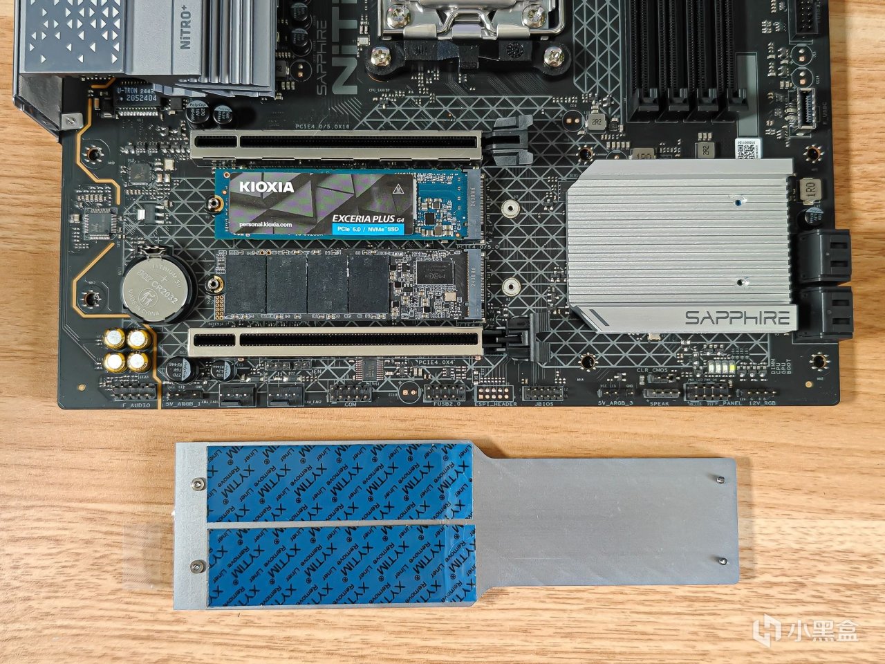 取下M.2散熱裝甲,M.2插槽是免工具設計,可以將硬盤直接裝上。M.2散熱裝甲背面有散熱墊,使用的時候別忘記把出廠覆膜撕掉。主板有2個M.2插槽,第一個支持PCIe 5.0x4,PCIe 5.0的NVMe SSD硬盤已經有很多面世的了,比如我安裝的就是一款鎧俠的PCIe 5.0 SSD硬盤。第二個M.2支持PCIe 4.0x4。