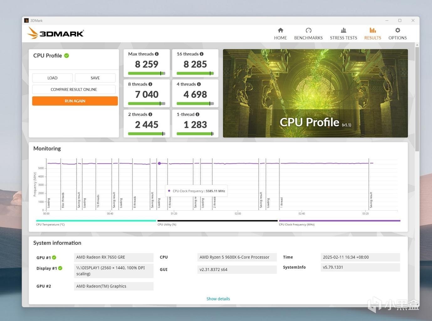 3DMARK CPU Profile,最大線程分提升到了8259,單線程提升到了1283。而原來默頻的時候,單線程1252,最大線程7696。