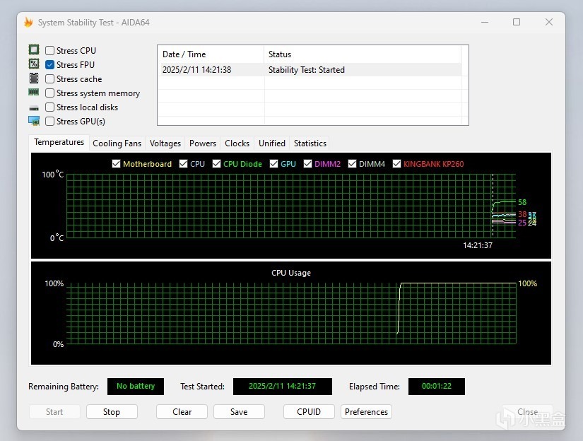 AIDA64 FPU壓力測試,看到溫度不到60度,真的是好涼爽啊。