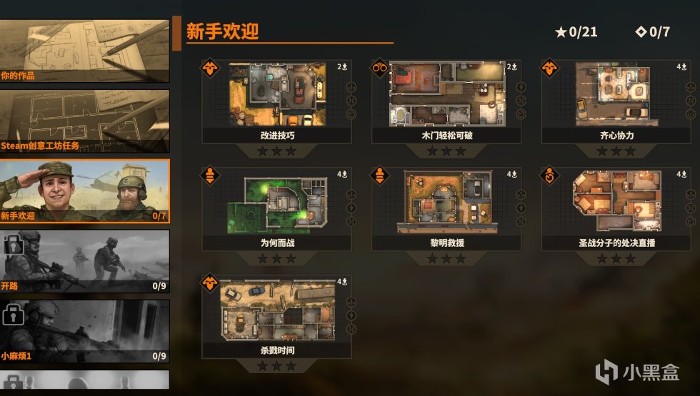 同时每次任务的最高评价是三颗星,emmm,第一次玩确实啥也不懂,进去就是猛猛干,手榴弹和闪光弹扔就完事了,结果就是永远不能初见过,角落里的敌人从未考虑过,导致小队十分容易团灭。