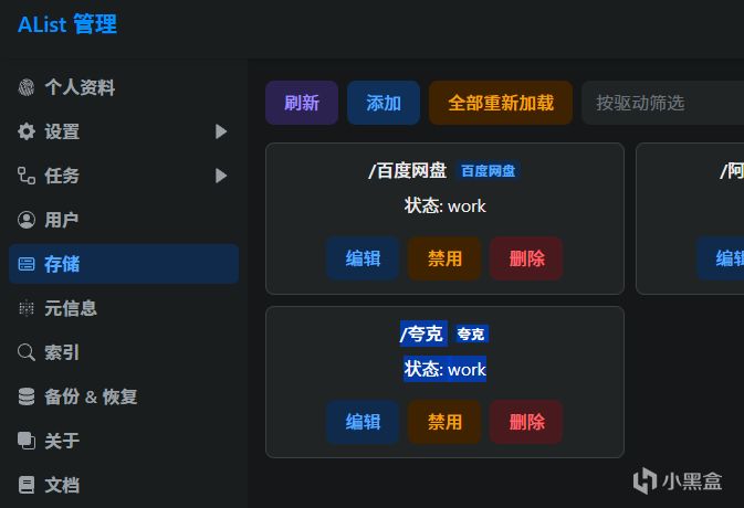 进入alist 的管理页面点击左侧存储,然后点击添加