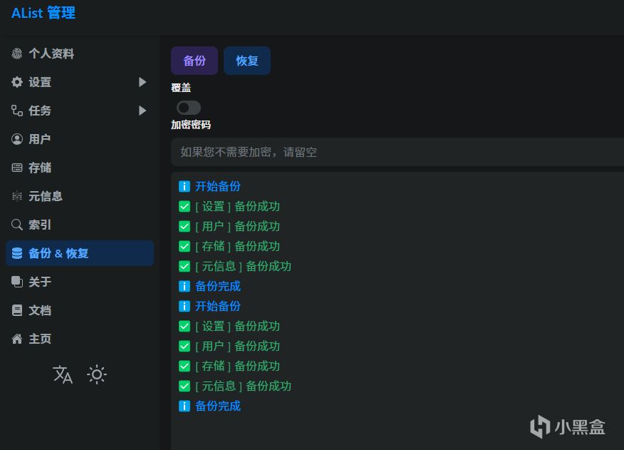 在app里登录新创建的alist,同样在管理——备份与恢复中恢复即可将挂载的网盘同步过来。