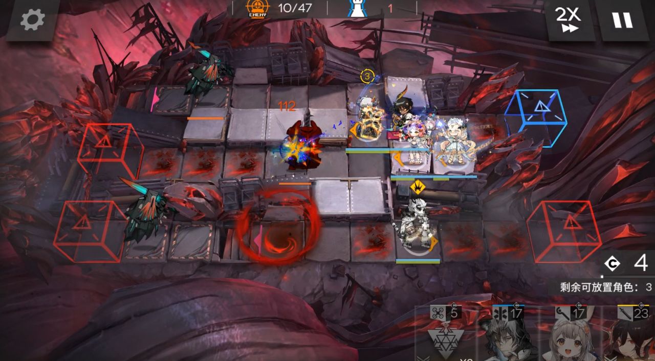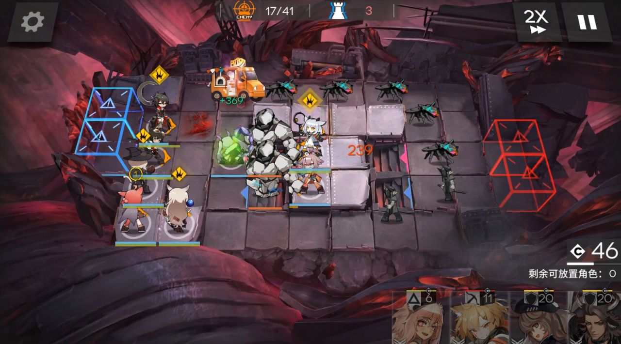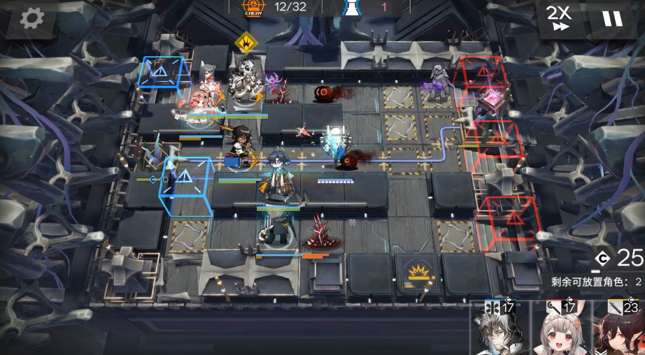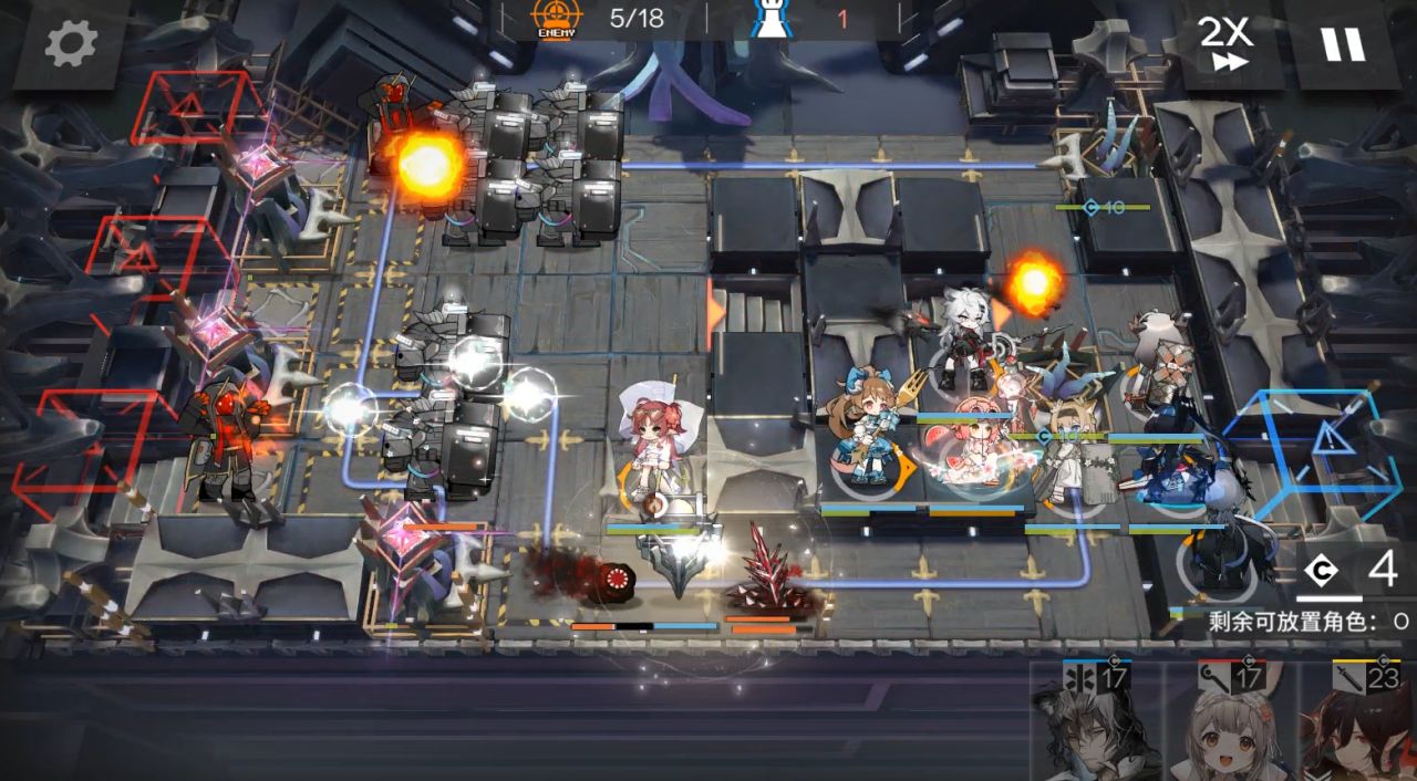 部署號角朝左,開藍門那邊的裝置,然後全圖打手技能好了就開推裝置。號角也能幫忙,這樣最下面的敵方裝置能先打掉。煌朝上,奶羊朝右,lgs朝上,塞雷亞。開右上的裝置,準備推上面的。中間的靠藍門裝置推到敵方中間炸掉,但是要注意這時候剛好有2個火球術士。全圖打手技能沒好,裝置會卡在粉毛那邊,導致火球範圍傷害炸到高臺,醫療壓力大。最好來個特種幫忙推一下,不過下圖練度沒有帶特種也過了。還有就是注意煌和塞雷亞那邊的阻擋數,到最後的時候小怪一直復活,必須快速把裝置推到左邊,炸掉3個裝置後敵方不會復活就隨便打了。