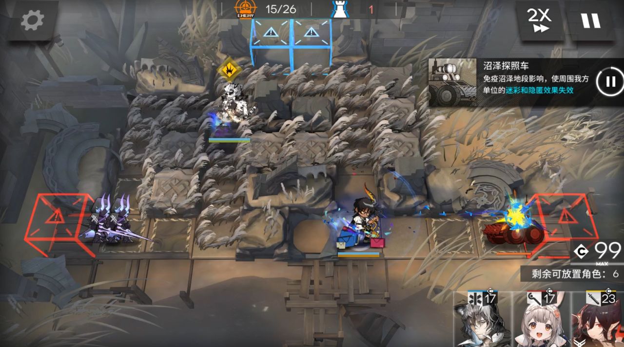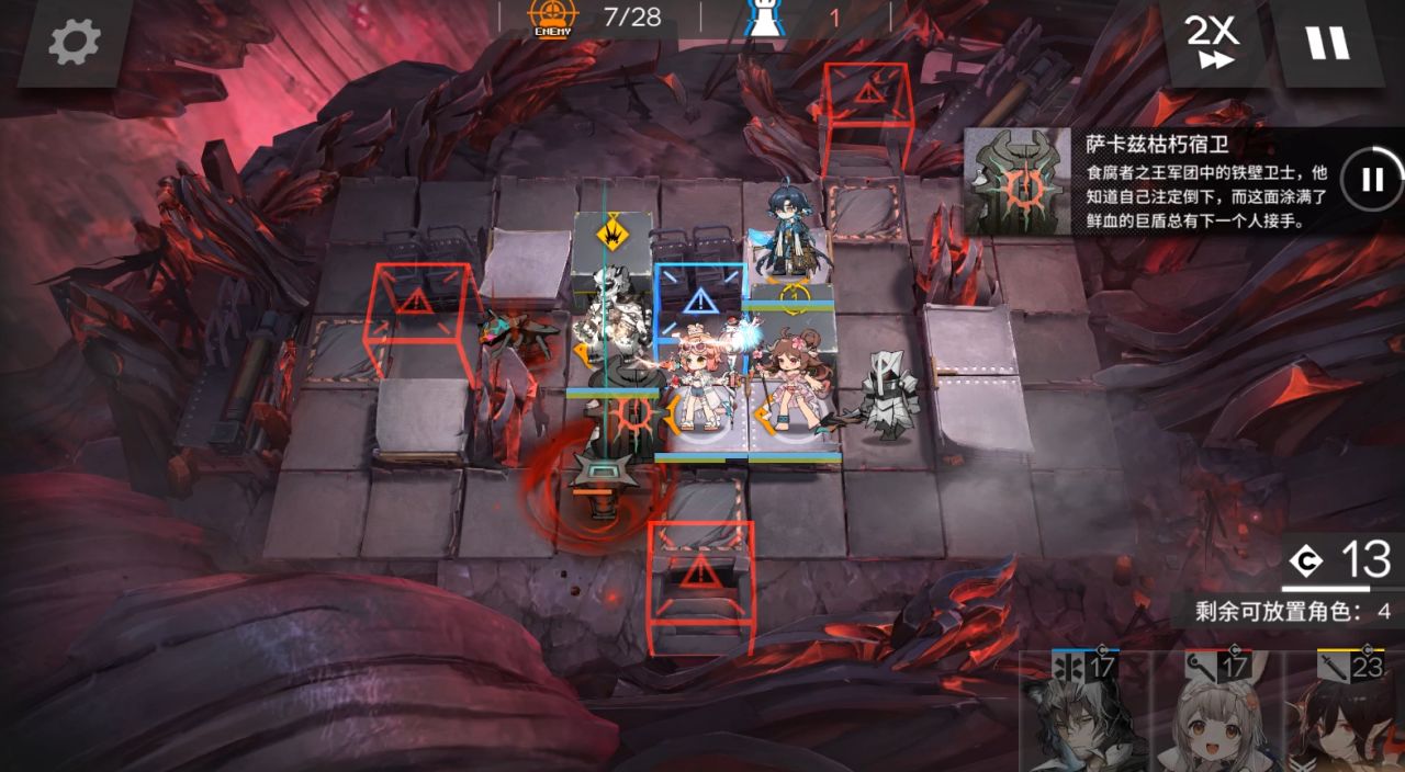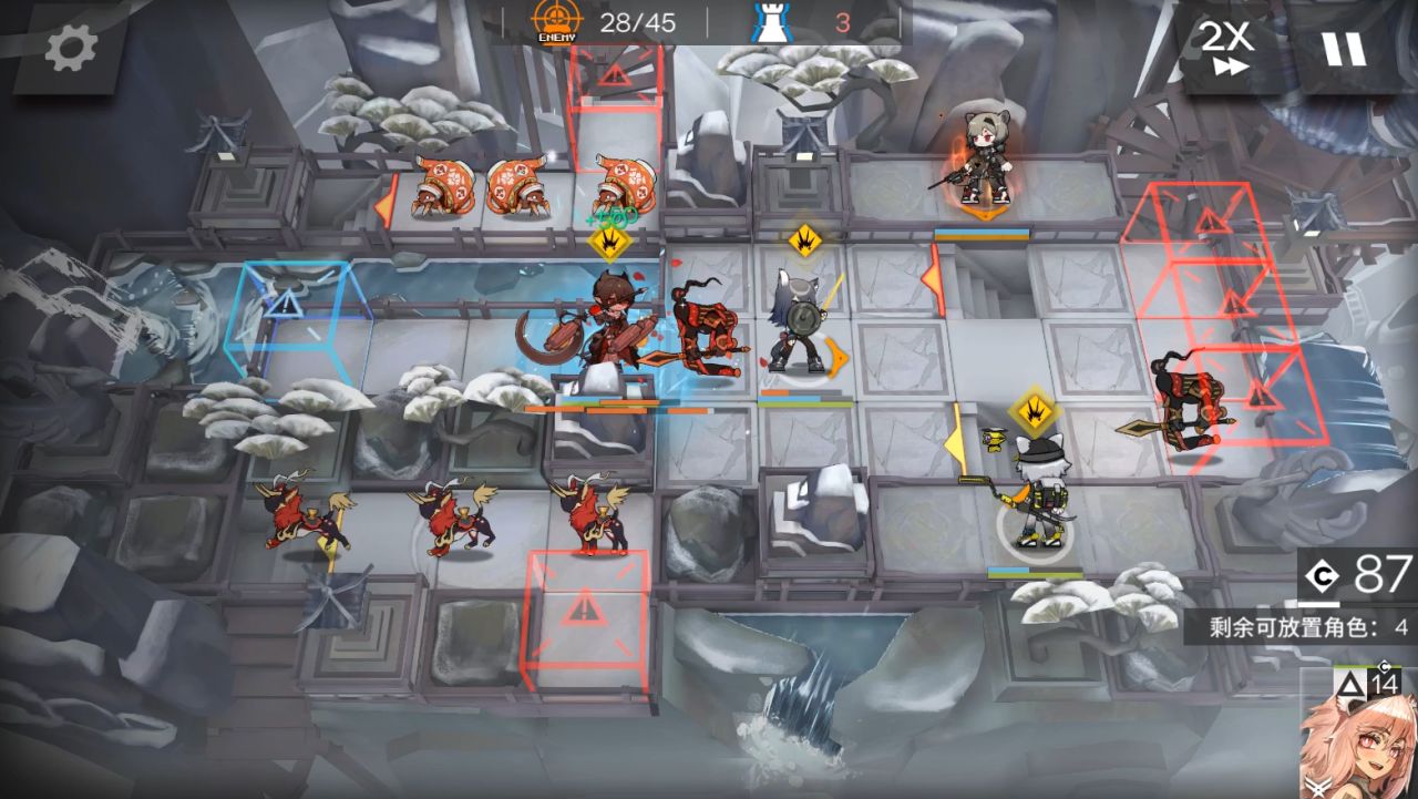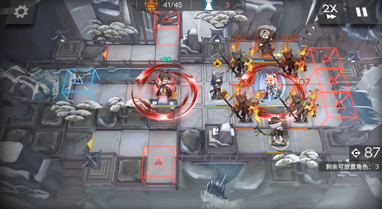 部署號角朝左,開藍門那邊的裝置,然後全圖打手技能好了就開推裝置。號角也能幫忙,這樣最下面的敵方裝置能先打掉。煌朝上,奶羊朝右,lgs朝上,塞雷亞。開右上的裝置,準備推上面的。中間的靠藍門裝置推到敵方中間炸掉,但是要注意這時候剛好有2個火球術士。全圖打手技能沒好,裝置會卡在粉毛那邊,導致火球範圍傷害炸到高臺,醫療壓力大。最好來個特種幫忙推一下,不過下圖練度沒有帶特種也過了。還有就是注意煌和塞雷亞那邊的阻擋數,到最後的時候小怪一直復活,必須快速把裝置推到左邊,炸掉3個裝置後敵方不會復活就隨便打了。
