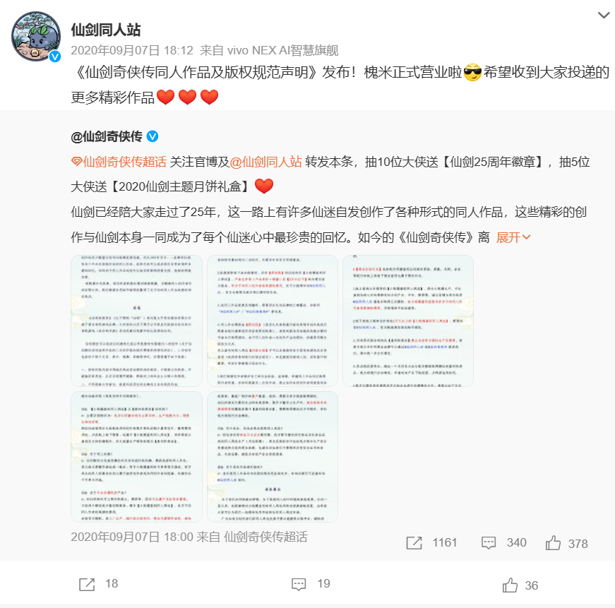 2020年9月7日,北京軟星發佈了《仙劍奇俠傳同人作品及版權規範聲明》,對於非盈利性質的仙劍同人作品,只需標明原作來源,無需向官方額外報備。這意味着,官方爲仙劍同人作品的合規二創開了綠燈,長期以來遊走在灰色地帶的同人創作者們,終於喫下了一顆定心丸。