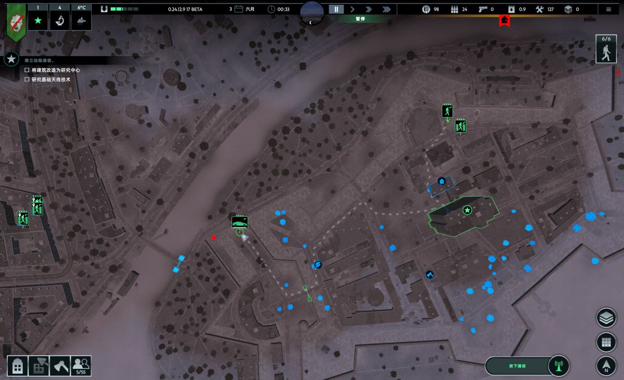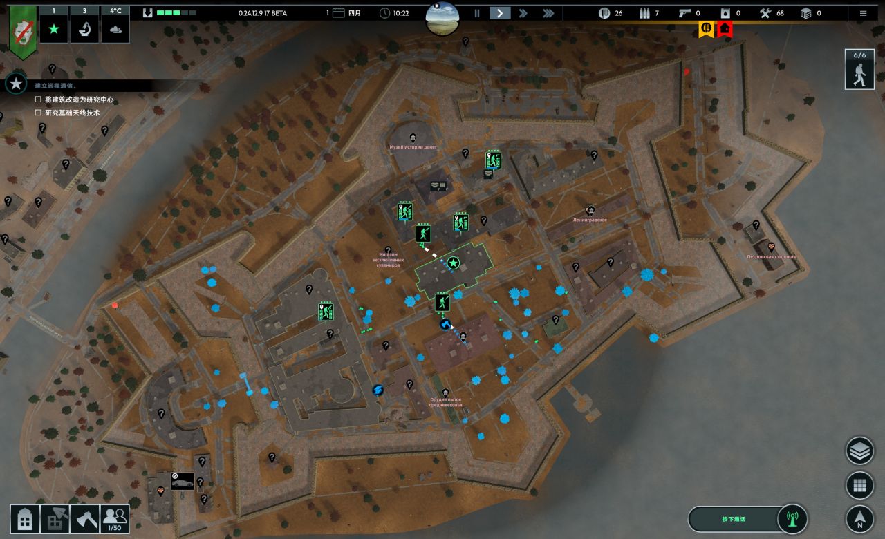 開局建六個隊,第一天先散開搜刮島上建築獲取啓動資金。晚上一個槍隊駐守最左側建築掩護牆外隊伍,另一個槍隊在橋頭射殺過河的感染者,其他隊伍繼續搜刮小島。