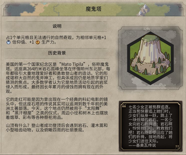 【开局点位】:★★★★★,极高。魔鬼塔提供鸽锤,能帮助玩家尽快过掉万神殿的同时,也能提高前期的生产效率。最重要的是,魔鬼塔在草原平原位置的刷新,大多伴随着丘陵/森林或资源,因此,魔鬼塔的相邻地产一般比较可观,同时又是只占据1个单元格的良好奇观,因此,完全符合前期的发展节奏。