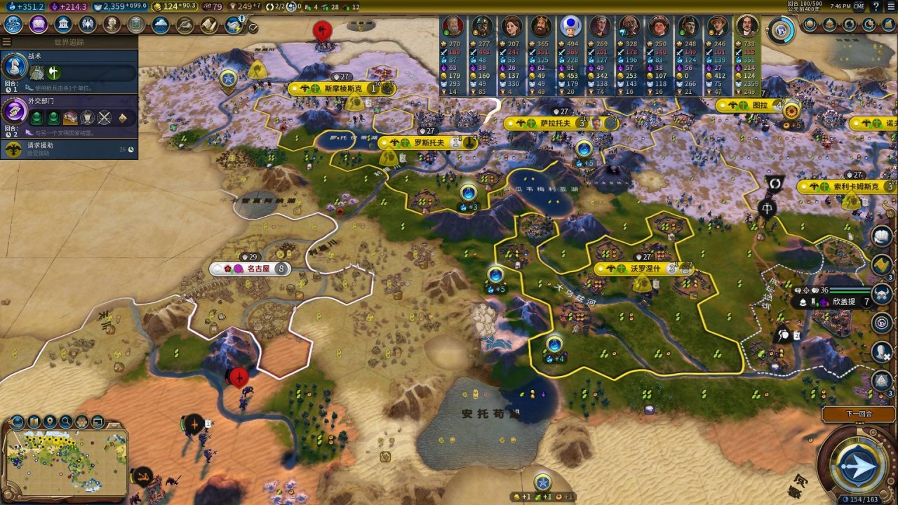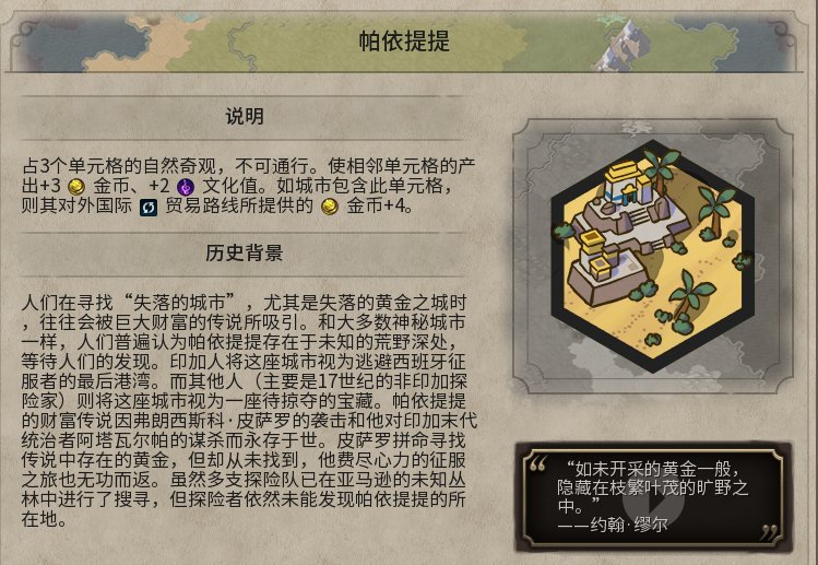 【奇观分析】:帕依提提虽然很强,但是要注意,极端位置的点位最好是由分城来坐,首都必须要有水,其他城市可以直接坐无水,未来利用水渠或改良提高住房这没什么问题,当然,建议是最好不要贴脸坐,而是用多个城市分食黄金国的加成。同时,当你吃到黄金国的加成后,记住科技线需要提高过ulk的效率,尽可能地不让科技线落后太多,否则容易掉节奏。