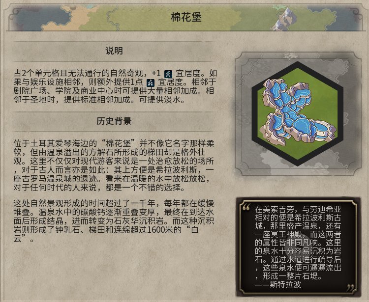 【基础信息】:占2个单元格且无法通行的自然奇观,+1宜居度。如果与娱乐设施相邻,则额外提供1点宜居度。相邻于剧院广场、学院及商业中心时可提供大量相邻加成。相邻于圣地时,提供标准相邻加成。可提供淡水。