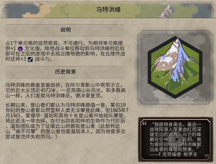 【基础信息】:占1个单元格的自然奇观,不可通行。为相邻单元格提供+1文化值。陆地战斗单位移动到马特洪峰附近后即可在之后的游戏中无视丘陵地貌的影响,在丘陵作战时还将+3 战斗力。