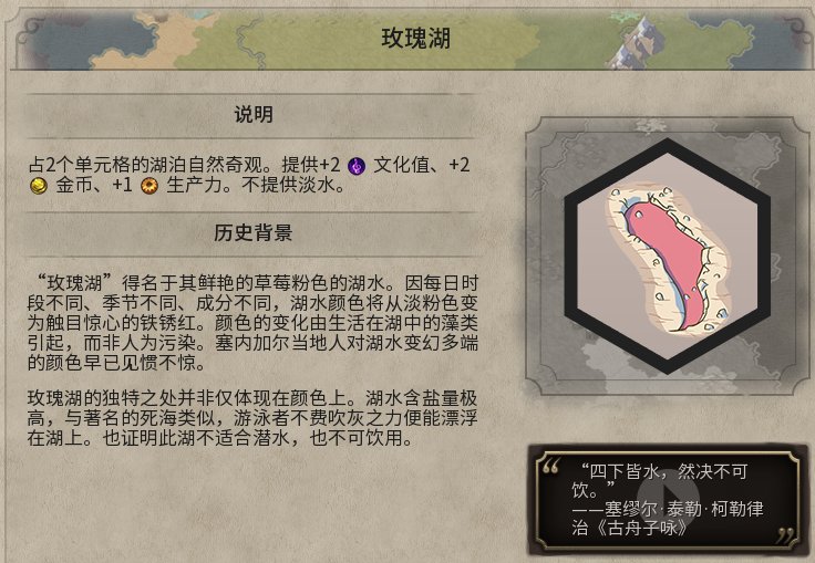 【基础信息】:占2个单元格的湖泊自然奇观。提供+2文化值、+2金币、+1生产力。不提供淡水。