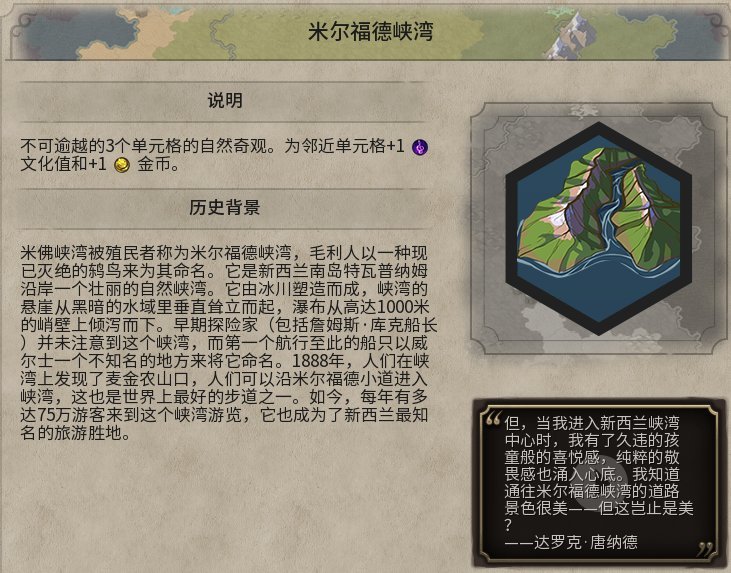 【随机点位】:★★☆☆☆,低。米尔福德峡湾的加成并不算突出,靠近海岸的奇观基本评分都不会太高,因为海洋远比陆地差。