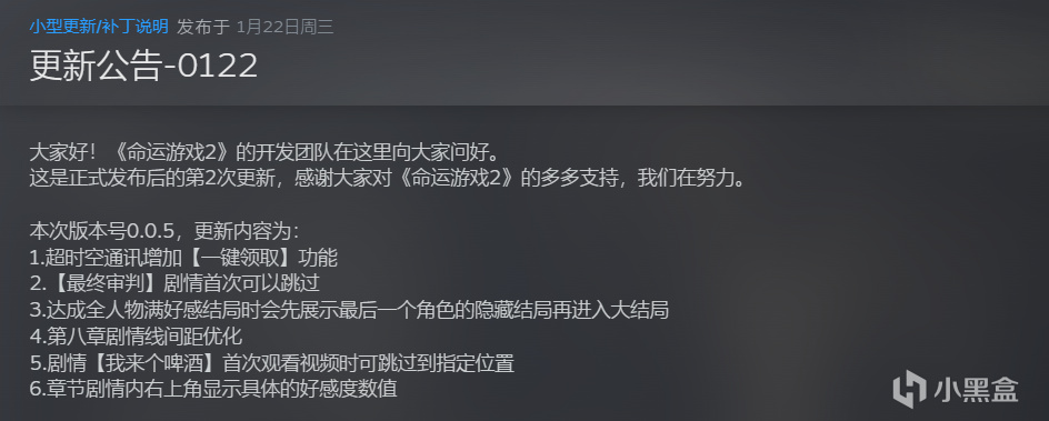 這個關鍵的更新是在1月22日,與之同時的還有【最終審判】那一部分劇情即使首次觀看也能直接跳過的更新。這兩個更新都使遊戲體驗獲得極大提升,而且這兩項更新都是在遵從了玩家們的建議之後實裝的。這樣聽勸並且及時更新的開發團隊,確實是挺不錯的。