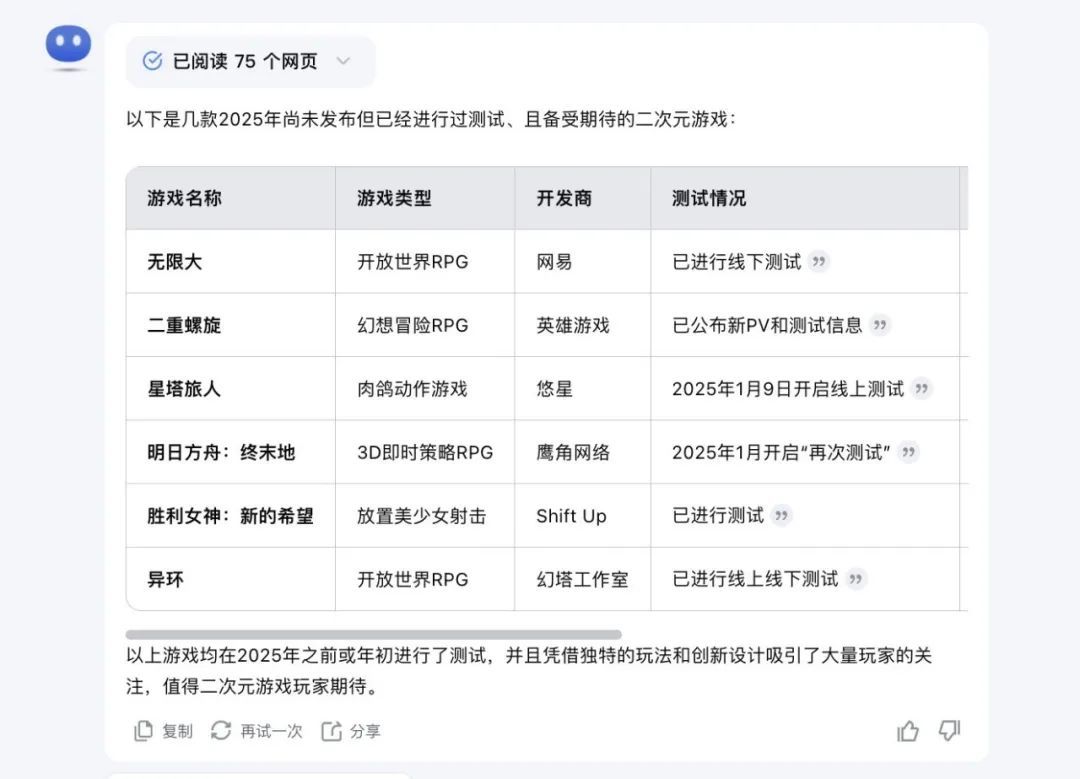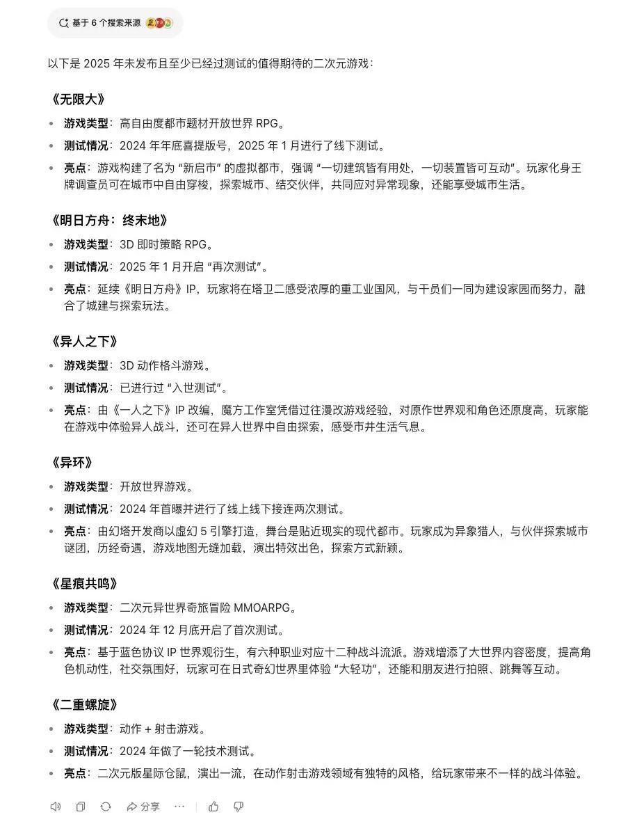 小坊同时也问了其他AIGC平台,回答基本类似。除了上述游戏,还有《异环》、《异人之下》、《星痕共鸣》等也有提及。