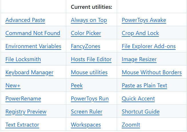 支持高级粘连,置顶窗口,保持唤醒,颜色取色器,检测错误命令,窗口的裁剪和锁定,管理环境变量,创建窗口布局和预览窗格,关闭选定进程,文件资源管理器引入加载项,管理编辑Hosts文件,调整图像大小,映射键盘键位,鼠标工具,批量重命名,快速启动,注册表预览,文本提取,屏幕缩放.......毕竟是微软自家的产品,可以说基本包含了用户平时在Windows使用时的大多数痛点。