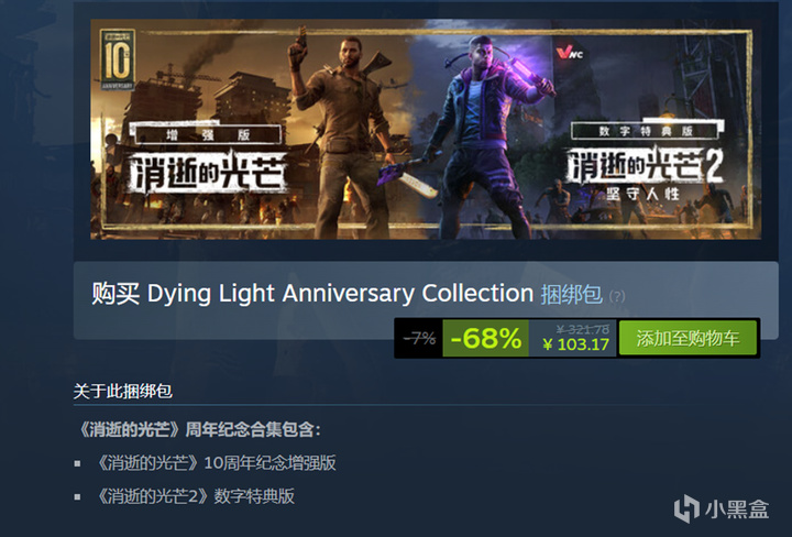 (3)《消逝的光芒》周年纪念合集,内含:《消逝的光芒》10周年纪念增强版、《消逝的光芒2》数字特典版。原价为321.78元,历史最低价(截止2025年2月9日)为103.17元。