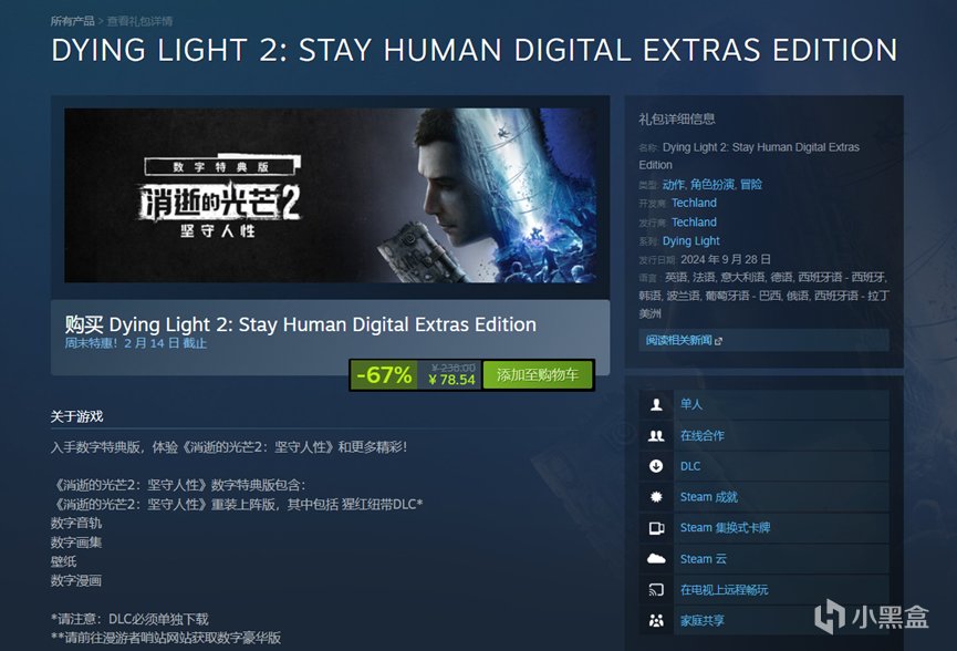 (2)《消逝的光芒2:坚守人性》数字特典版,内含:《消逝的光芒2:坚守人性》重装上阵版、数字音轨、数字画集、壁纸、数字漫画,同样包含游戏的全部剧情。原价为238元,历史最低价(截止2025年2月9日)为78.54元。