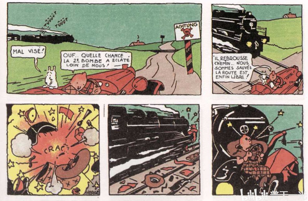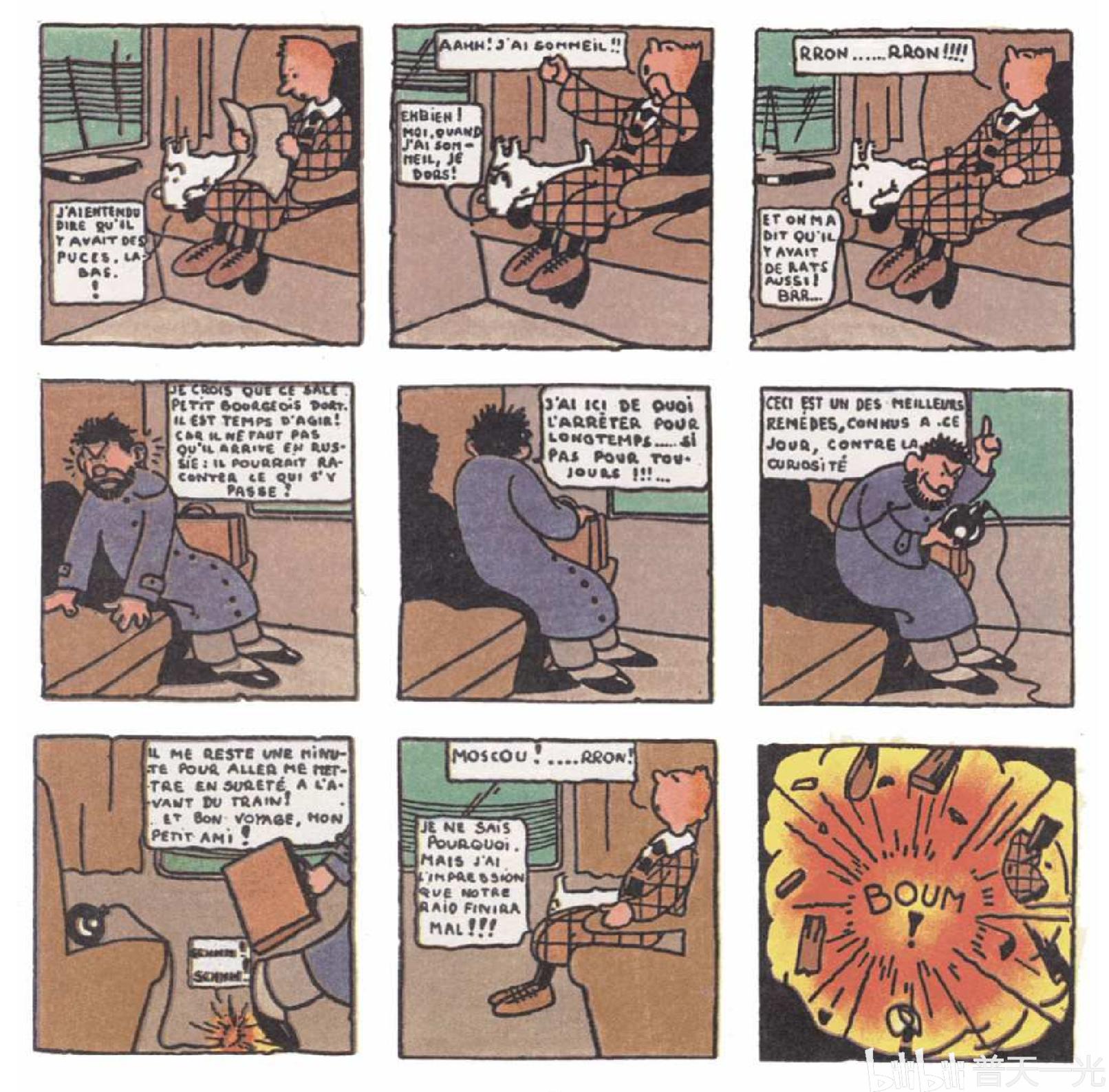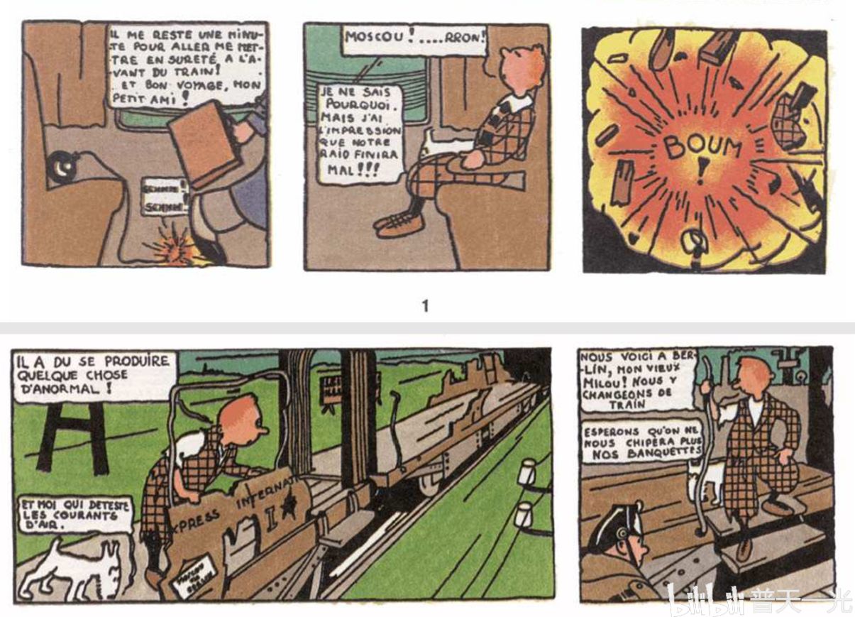 第一页就被苏联特务人员用炸弹炸掉了火车以灭口,在遇险速度上大概是丁丁系列最快的