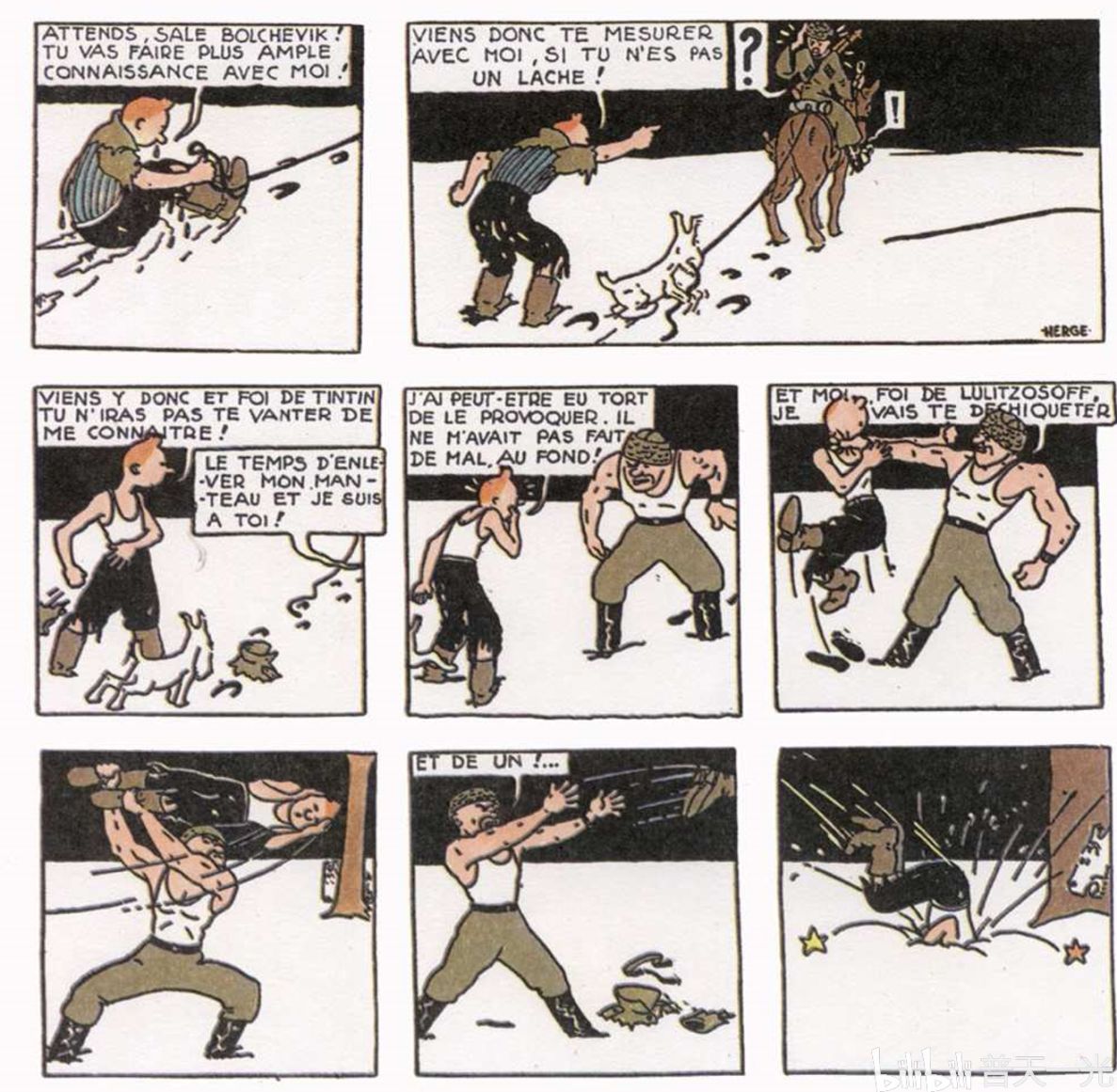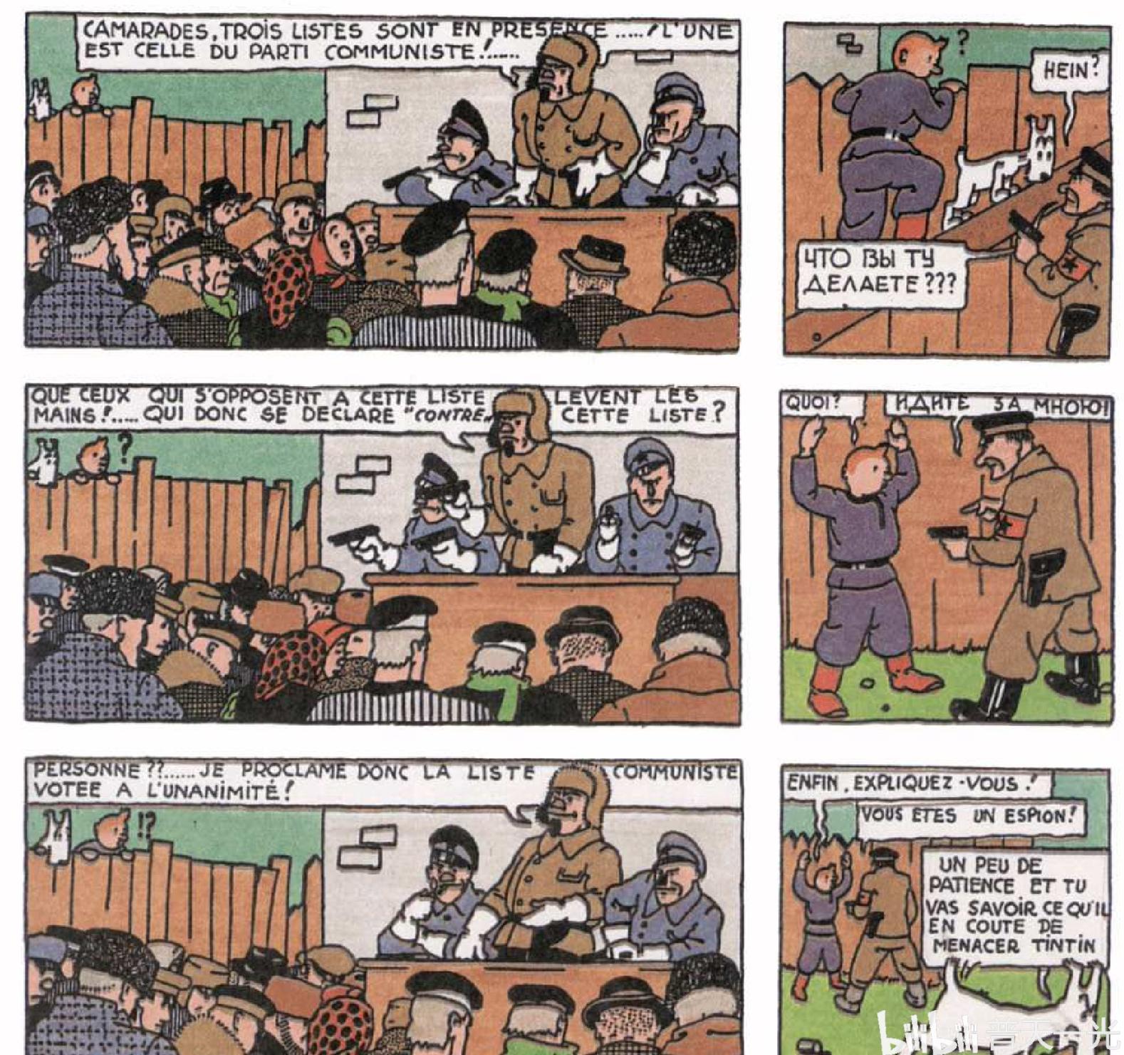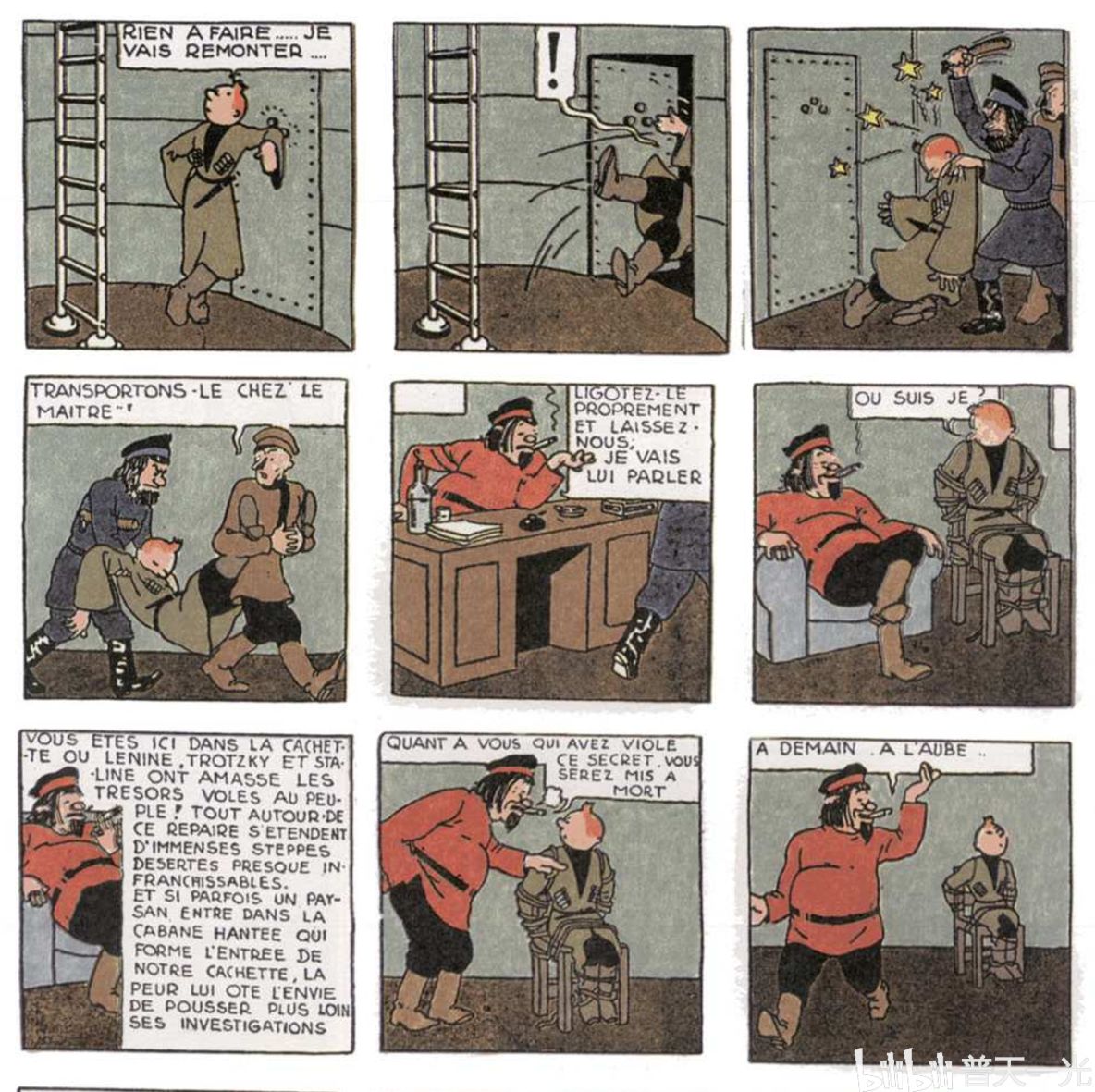 说到这里,其实已经不难看出,这个故事虽然简单,但已经有了丁丁系列一贯故事风格:出行——遇险——脱险——胜利的雏形,只是整个故事叙事手法稍显稚嫩,许多情节都安排得相当突兀,起承转合得并不自然。更重要的是,整个故事从始至终带有明显的反苏情绪,力图将苏联描绘为一个铁幕统治下民不聊生的人间地狱。在此举几个例子: