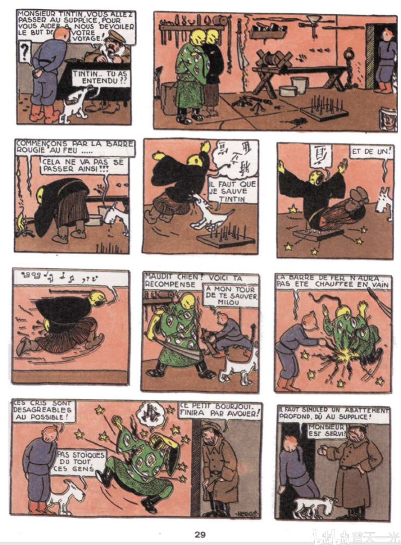 丁丁被契卡抓住审讯,结果负责拷问的人竟是两个身着长衫、留着辫子的“大清人”。这两个人口吐意义不明的象形字符,意图用封建时代的刑具对付丁丁,结果被耍的团团转。这牵强附会地抹黑中国人的一页相信才是《丁丁在苏联》不能在中国出版的真正理由,也是整个故事以及埃尔热一生的败笔。