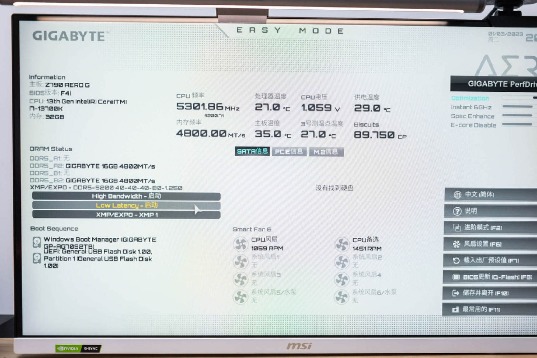 而最讓我感覺興奮的是,技嘉目前已經在最新的BIOS中增加了處理器體質評分功能。就位於高級模式右側的電壓信息一欄,我這顆新買的I7-13700K處理器的體質就被打了89.75CP的分值。