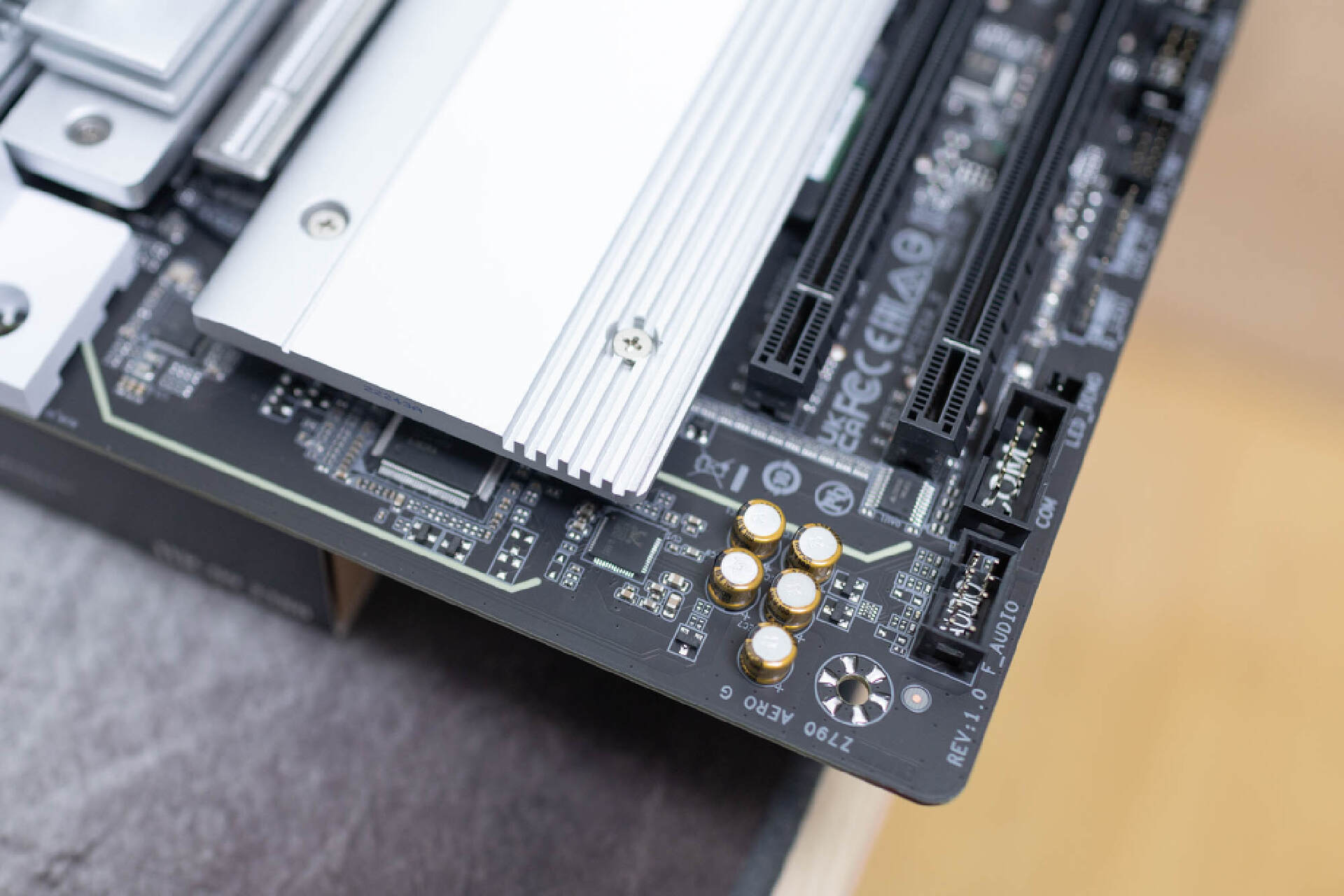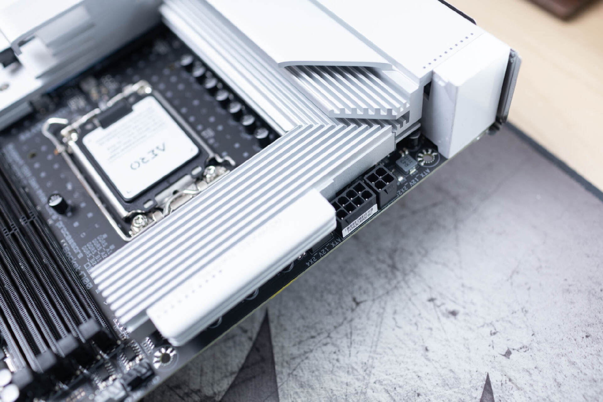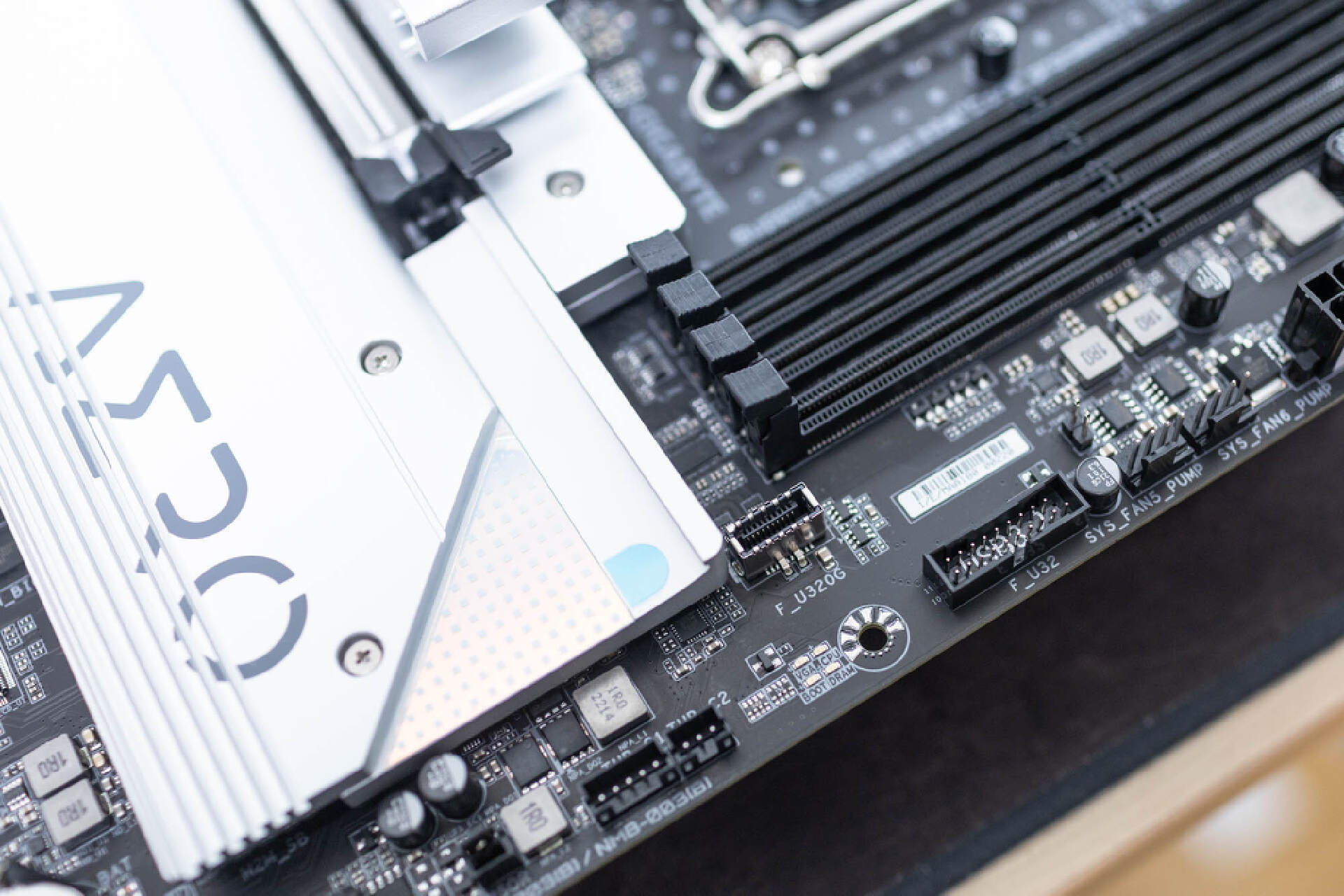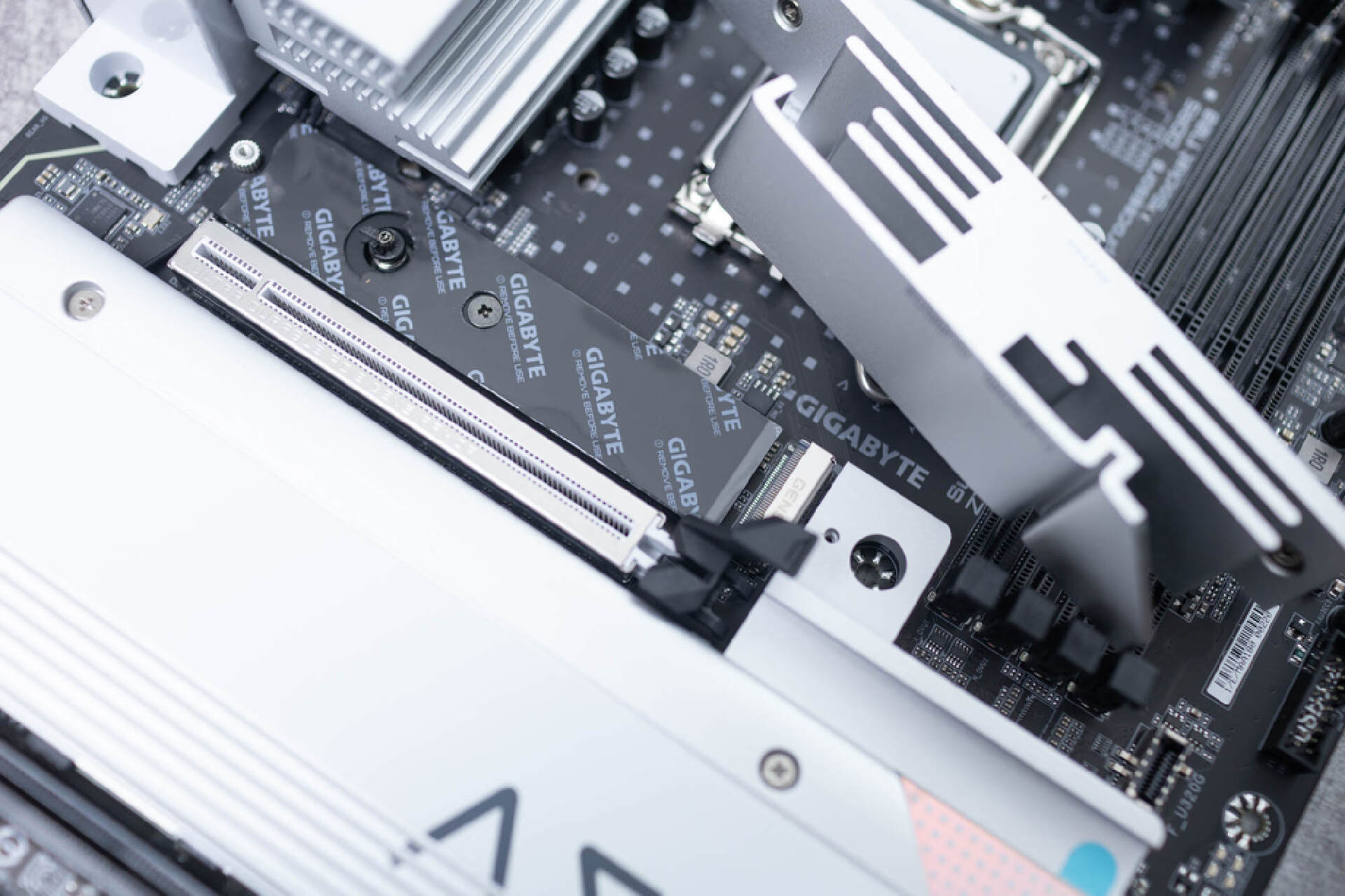 安裝上主板自帶的硬盤散熱器後,真的非常霸氣。自帶的散熱裝甲側面平整,和顯卡插槽之間保留了充足的間隙。