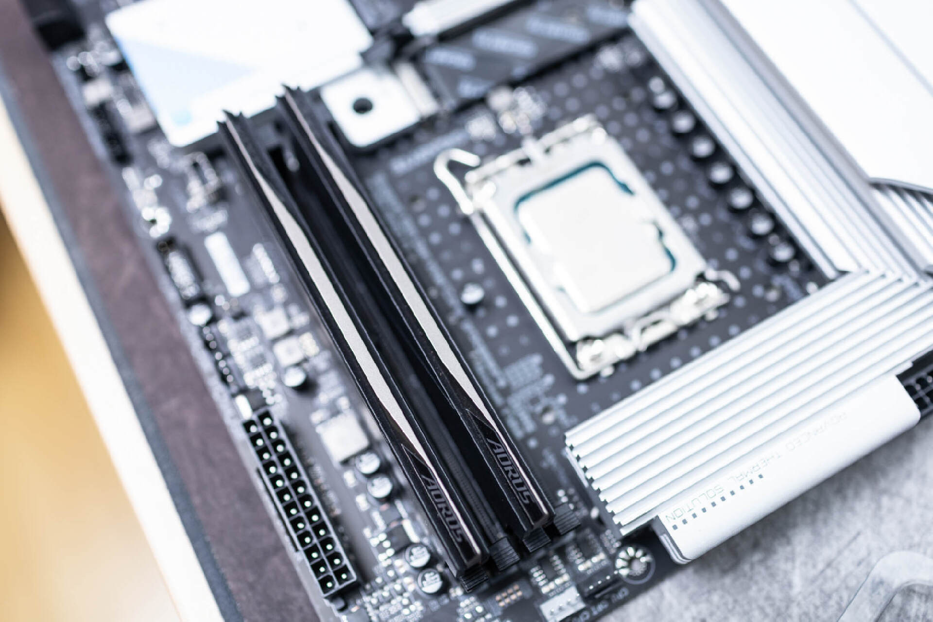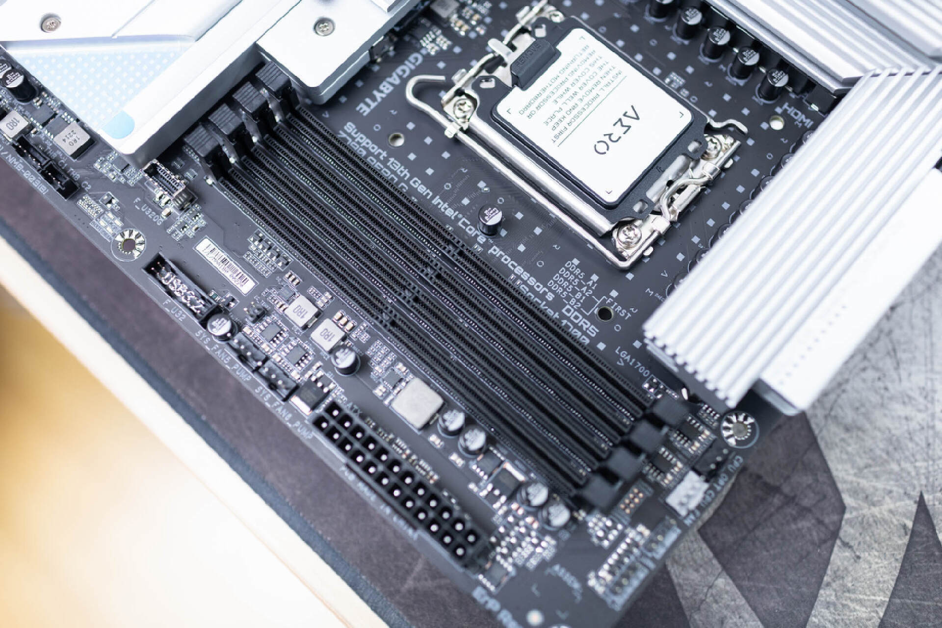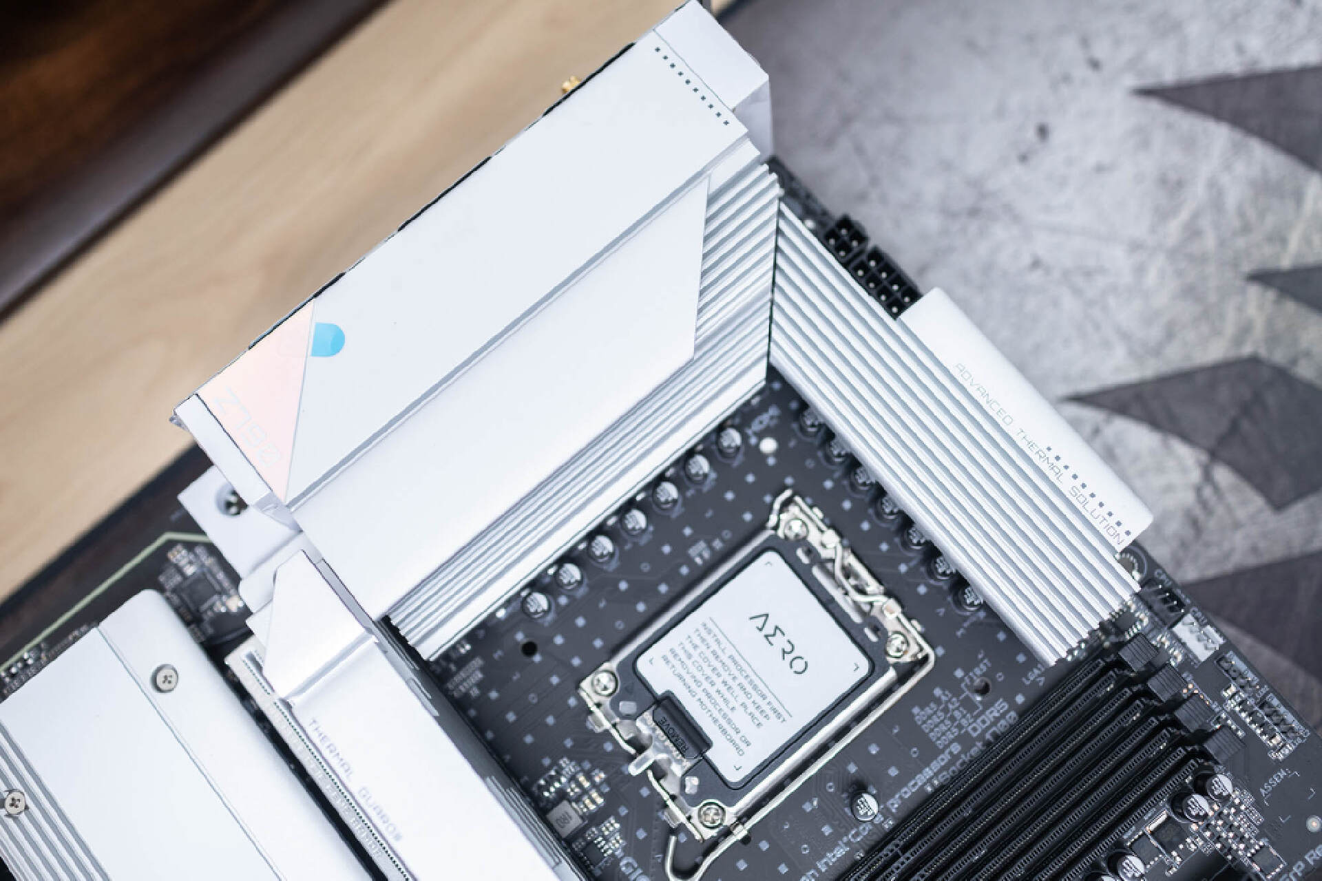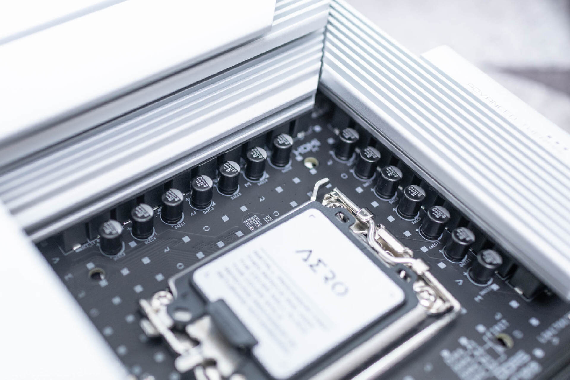 CPU底座採用是LGA1700接口,支持最新的第12,13代酷睿處理器。底座樣預留了防呆口和一鍵拆改設計,並且還配置了帶有AERO標識的保護蓋。
