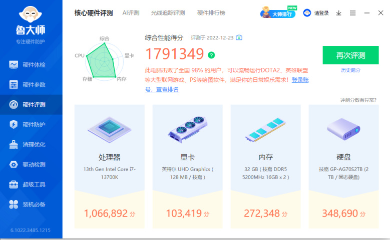 魯大師跑分,無獨立顯卡的情況下接近180W分,Intel酷睿13700K處理器的性能是增強了不少。