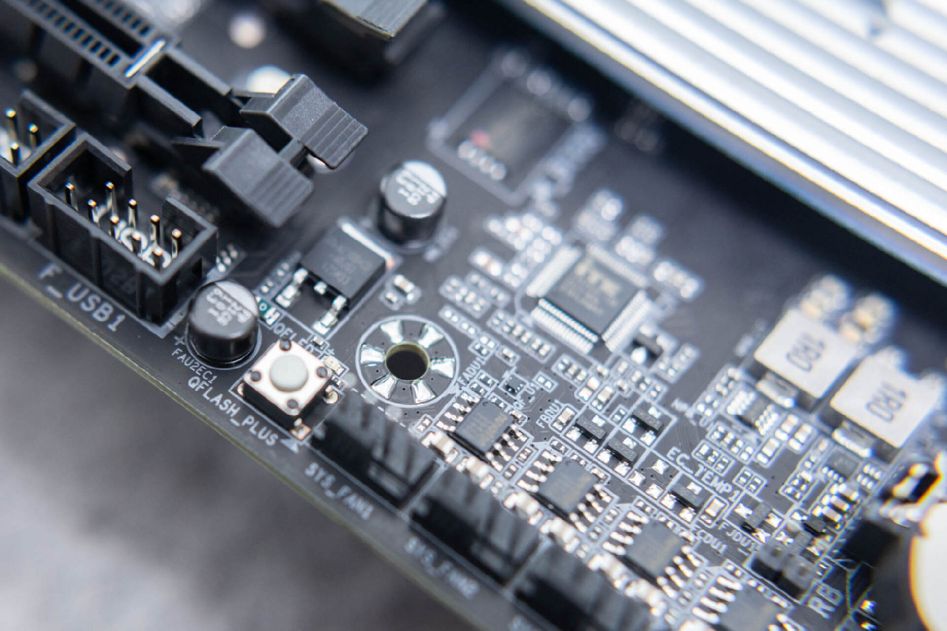 主板的底部佈置了大量的USB,COM,FAN口和ARGB接口,各類控制接口等。在這裏,你還能找到獨立的Q-Flash Plus 按鍵,通過它,你可以免安裝CPU、內存、顯卡,直接更新BIOS。