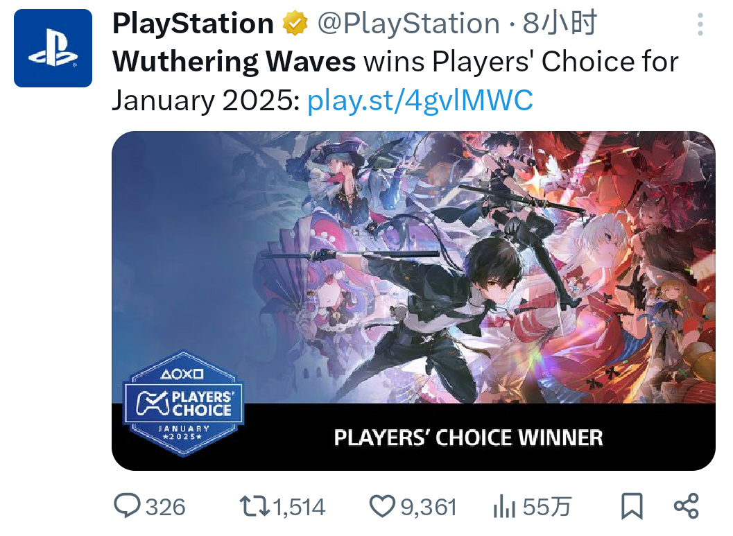 鳴潮獲得Playstation一月份玩家選擇獎,由官方發起玩家投票選出,每月一次,投給當月發售的新遊(鳴潮在25年一月上線PS),官方發文慶祝感謝玩家,並表示希望在大家在2.1版本的釣魚冒險玩得開心。
