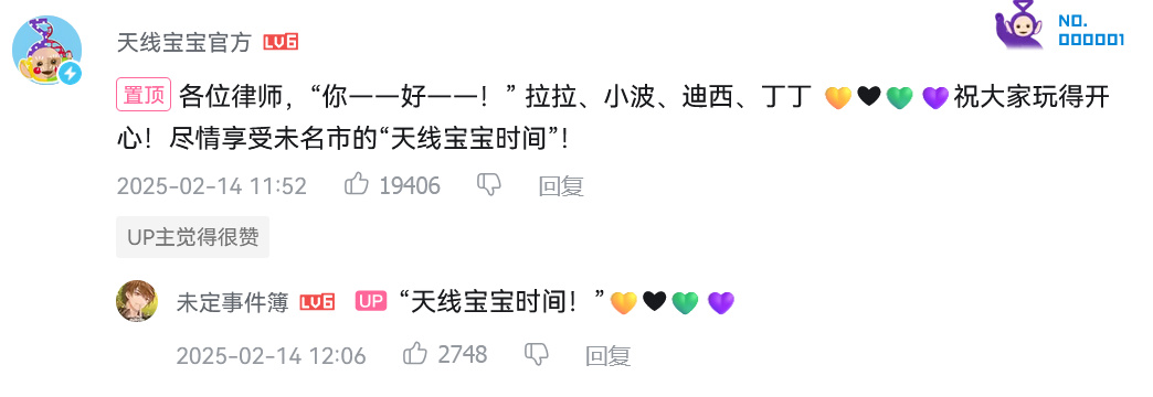 未定事件簿於情人節當天發佈聯動PV,官宣聯動天線寶寶,聯動時間爲2月18日11:00,目前聯動產品活動未定,而聯動角色方面玩家驚訝配色居然能對得上,這一腳油門踩進幼兒園還是挺可愛有活的。
