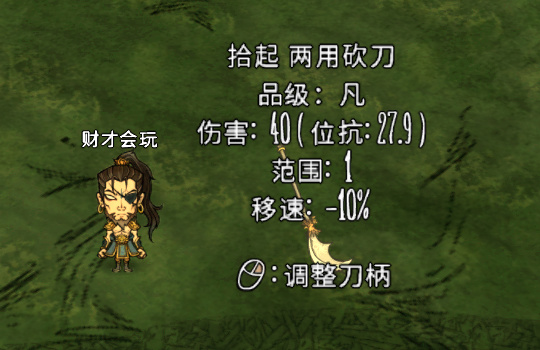 两用砍刀:放在地上可以在长刀短刀之间切换,攻击力都为40点伤害。装备长刀时,移速会减速10%,长刀时每次受到攻击有70%的概率进行格挡(免疫伤害),当格挡效果叠满到10层时,可以释放技能战意威慑,对周围生物第一次造成25点真实伤害,之后12秒内每秒造成15点真实伤害,并且每次造成伤害都可以使目标进入僵直。