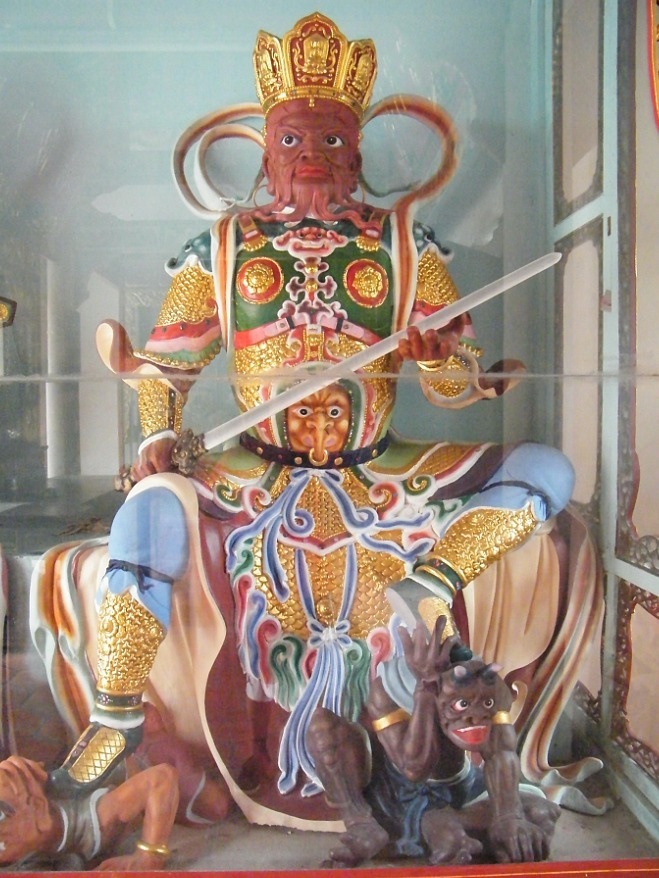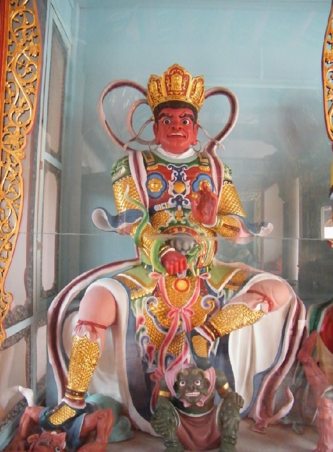 形象: 身穿甲冑,手持龍或蛇,雙目圓睜。