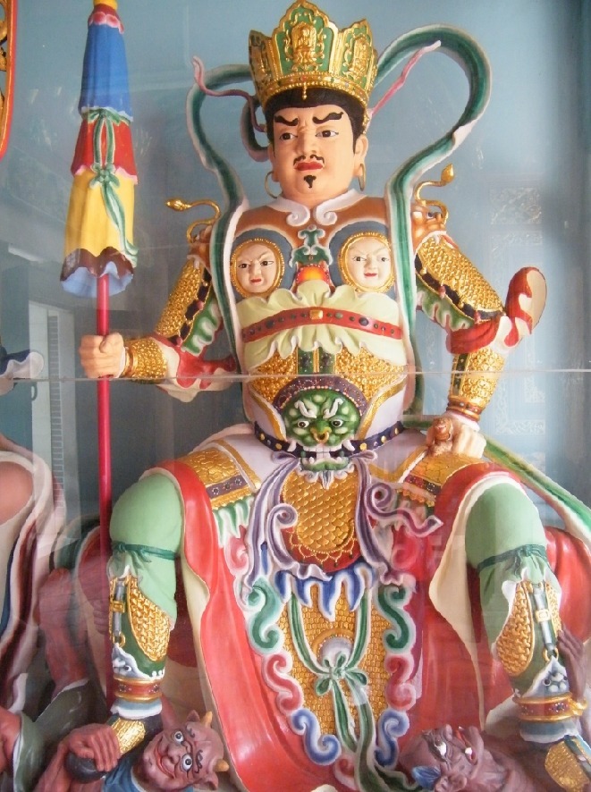 形象: 身穿甲冑,手持寶幡或寶塔,面容肅穆。