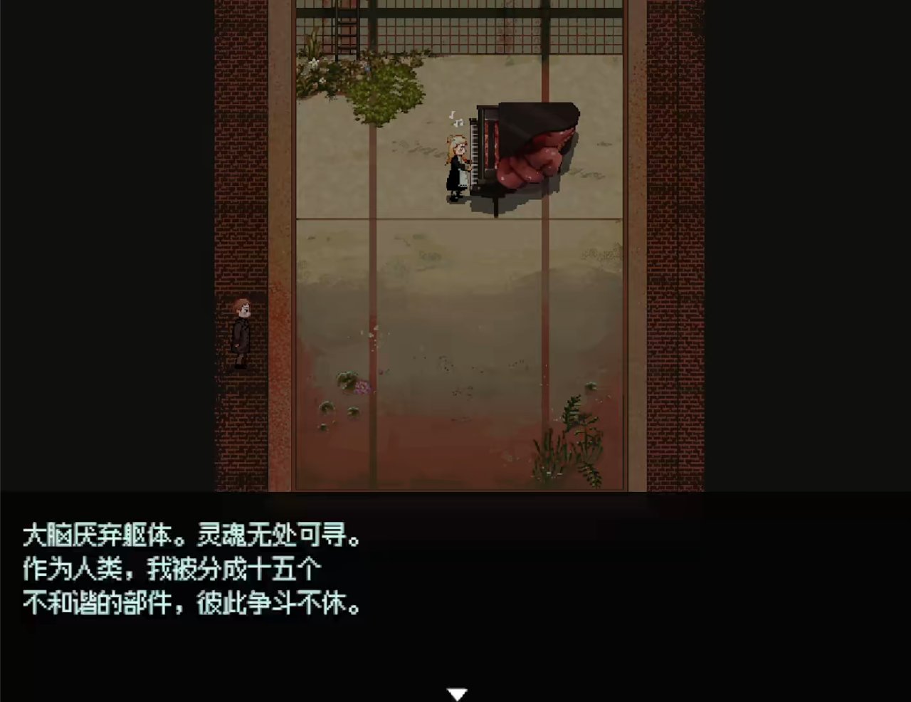 游戏用血肉美学缝合了大量的超现实主义和前苏联冷峻风格的建筑,利用像素风这一特殊的媒介放大了场景的粗粝感,强化了废墟般的荒凉氛围。