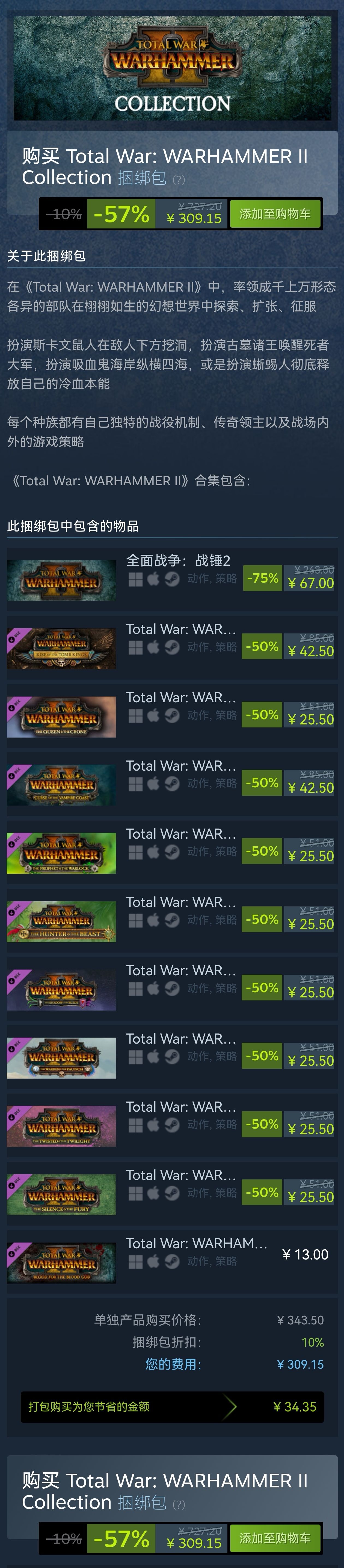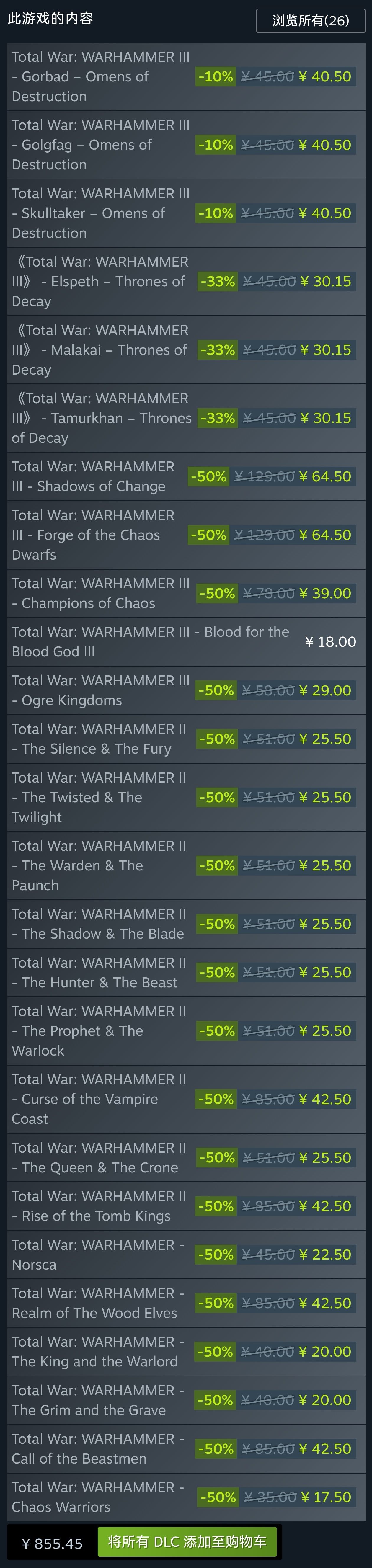 大家好,今天Steam开启了周间特惠,而世嘉旗下的《全面战争:战锤》三部曲迎来了折扣,需要注意的是,全战2和全战3都是史低,而全战1不是史低,建议可以再等等,因为现在全战1的价格离史低的价格差了几倍,所以现在买其实是有点亏的,至少买起来不太舒服,而《全面战争:战锤》旗下DLC一样迎来了折扣。