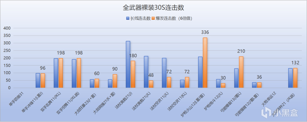 PS:本篇不讨论技能的影响,以法杖为代表的武器有不少令人惊喜的技能,在必要时会据此改变连招乃至整个体系的构建。单手防御和火枪幸运数据缺失的原因是受武器影响太大,对比效果差所以删除了。武器名字后面的数字和字母分别对应选择的刻印及连招按键,统一无词条,护符是暴击异变回蓝,不同武器初始攻击力可能有少量差别。
