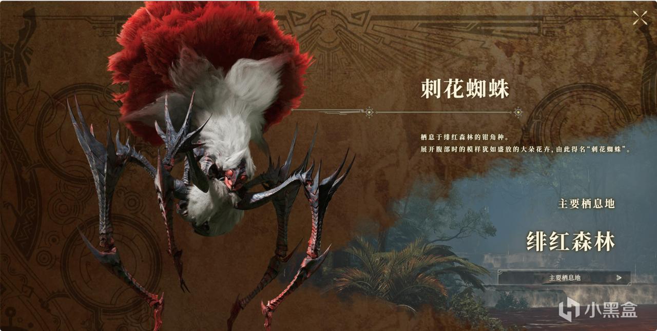 栖息于绯红森林的钳角种。 展开腹部时的模样犹如盛放的大朵花卉,由此得名“刺花蜘蛛”。