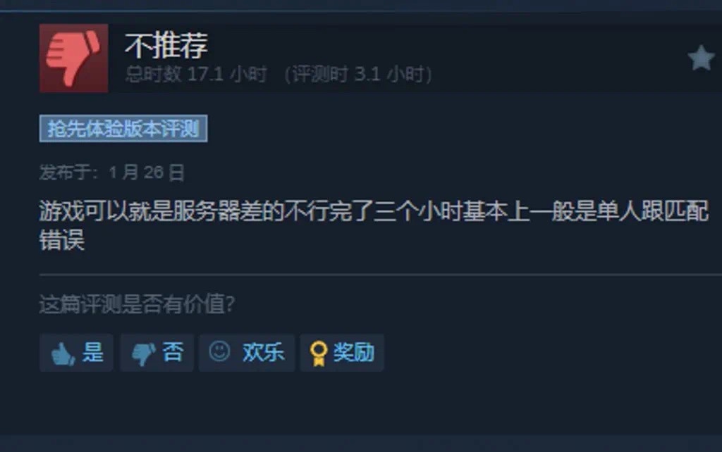 然而這款遊戲的成績相當一般,評價數量僅100多條,好評率也是褒貶不一。主要還是因爲這款遊戲是一個小團製作,因此完成度較差,對於PVE玩法來說內容太少(只有一張圖),而對於PVP玩法來說,卻因爲團隊發行能力較差,所以缺少玩家匹配不到人。並且還存在服務器網絡連接不穩定、一些遊戲性BUG等等。