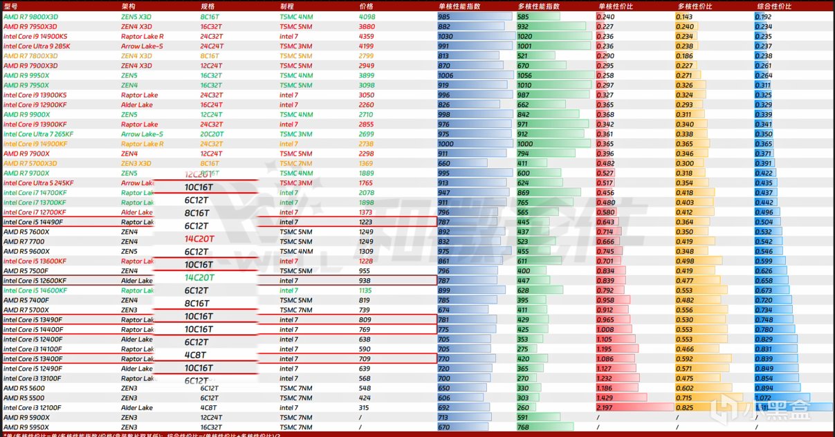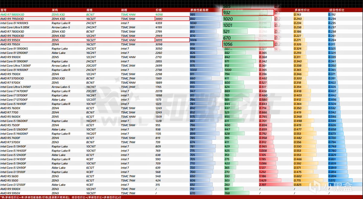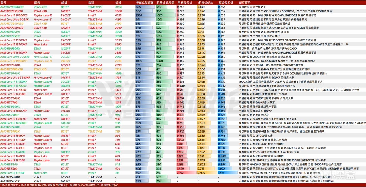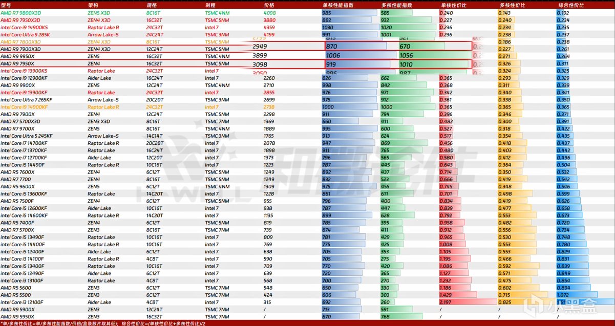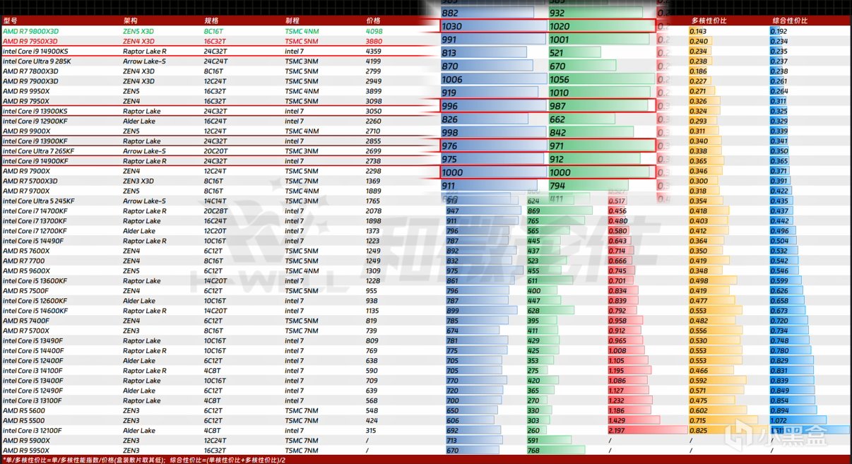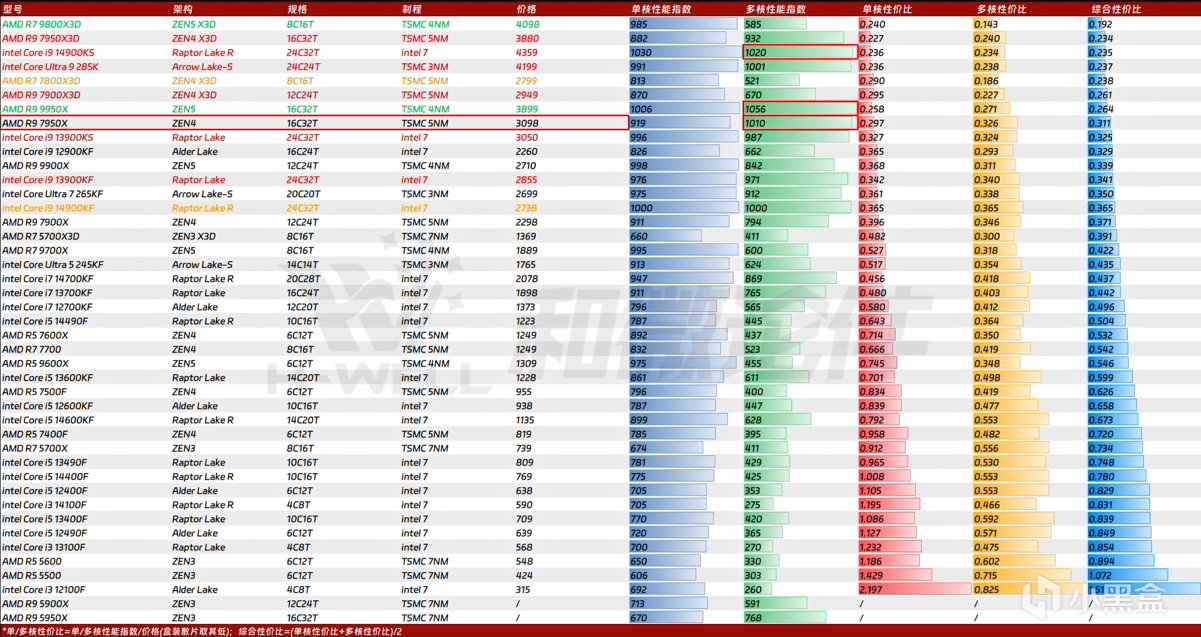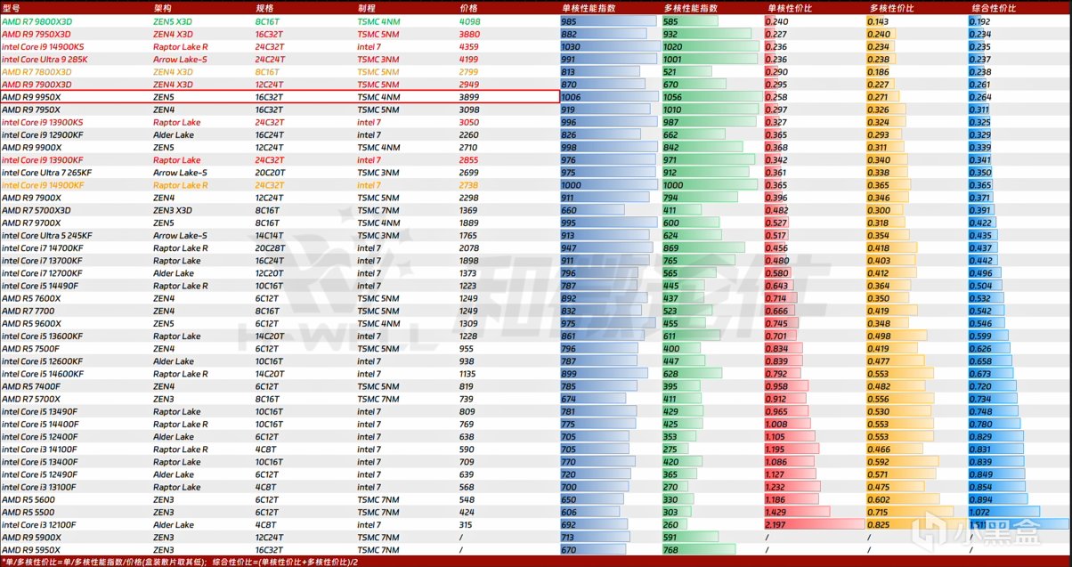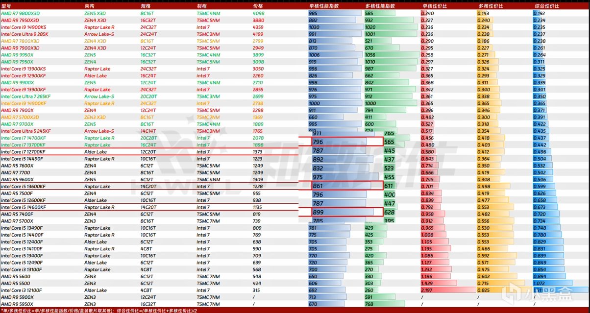 其他主流產品,我們就一起來細細梳理吧。這是綜合性價比排名圖,算法是前面的(單核性價比指數+多核性價比指數)/2,非常粗糙,但是沒關係,接下來我們一起使用人工冒泡排序法手法將它細化,一一糾察錯誤。性價比排名最低的,是來自AMD的9800X3D,因爲遊戲性能當世無敵,所以實際的性價比會比表格中高一點,價格方面,散片4100左右,相比上個月降低了300,如果你打算近期入手50系,我也不勸你等了,買了就買了吧,總體評價是 可以購買。