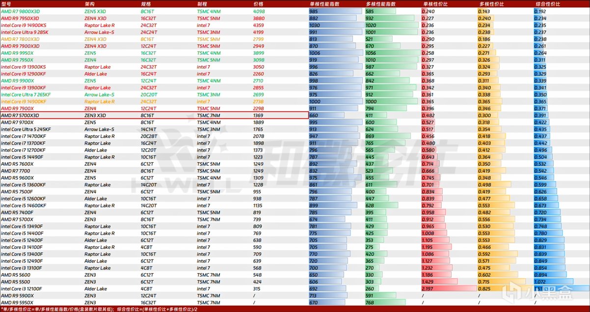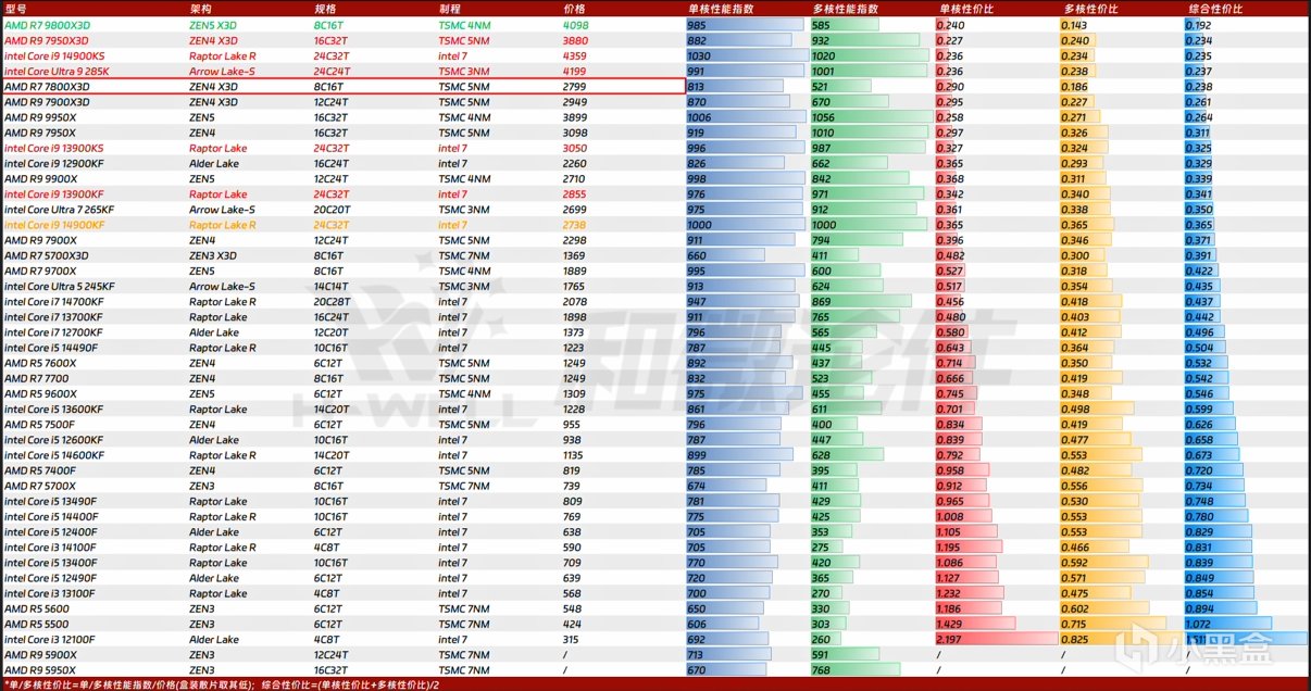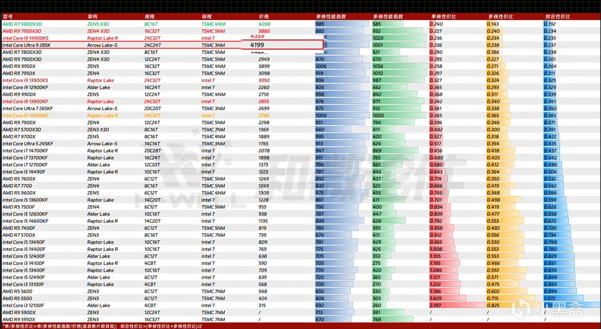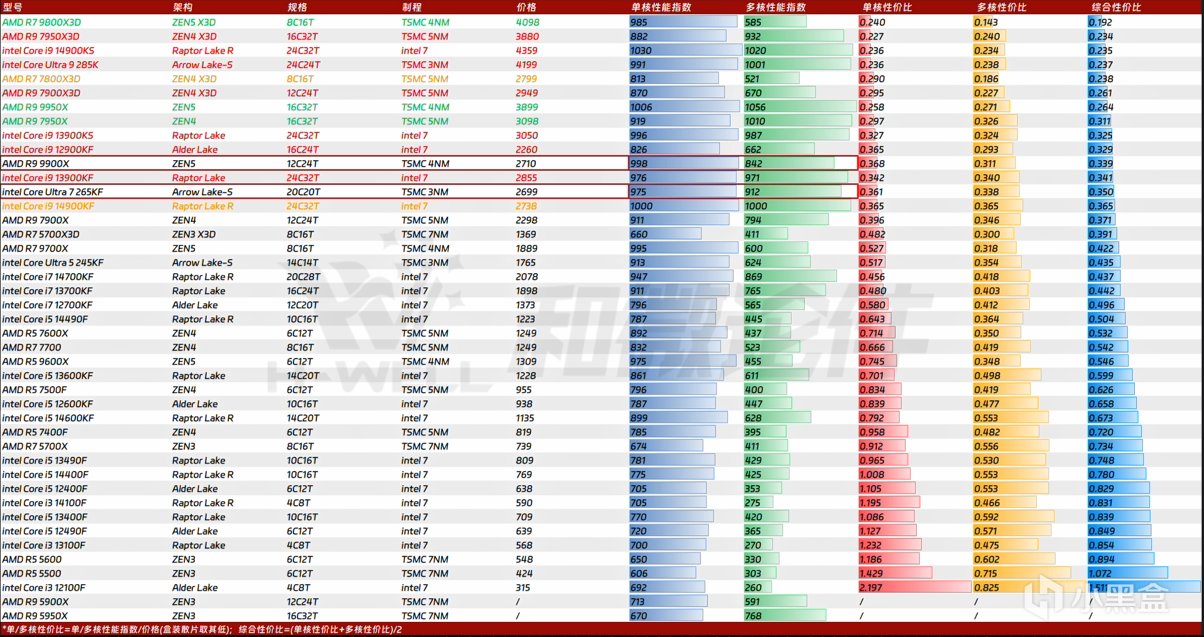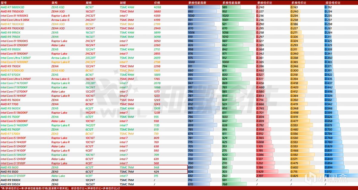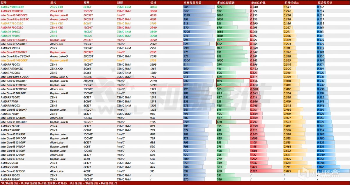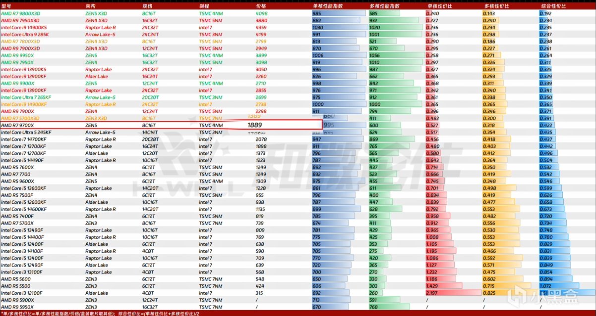 其他主流產品,我們就一起來細細梳理吧。這是綜合性價比排名圖,算法是前面的(單核性價比指數+多核性價比指數)/2,非常粗糙,但是沒關係,接下來我們一起使用人工冒泡排序法手法將它細化,一一糾察錯誤。性價比排名最低的,是來自AMD的9800X3D,因爲遊戲性能當世無敵,所以實際的性價比會比表格中高一點,價格方面,散片4100左右,相比上個月降低了300,如果你打算近期入手50系,我也不勸你等了,買了就買了吧,總體評價是 可以購買。