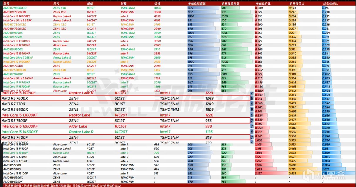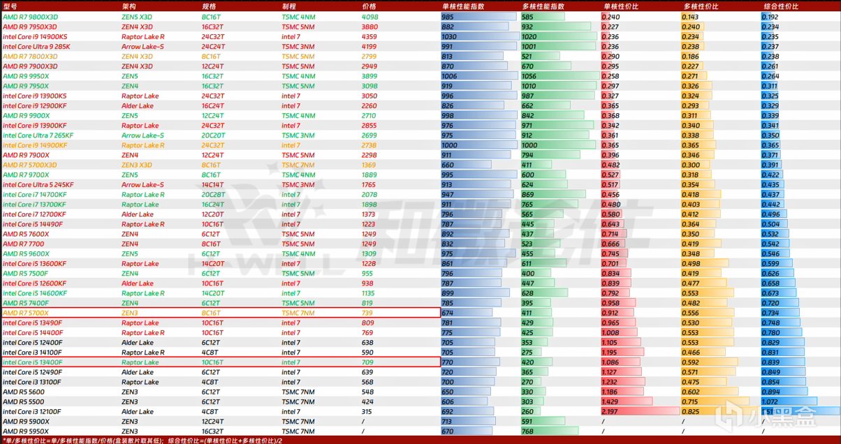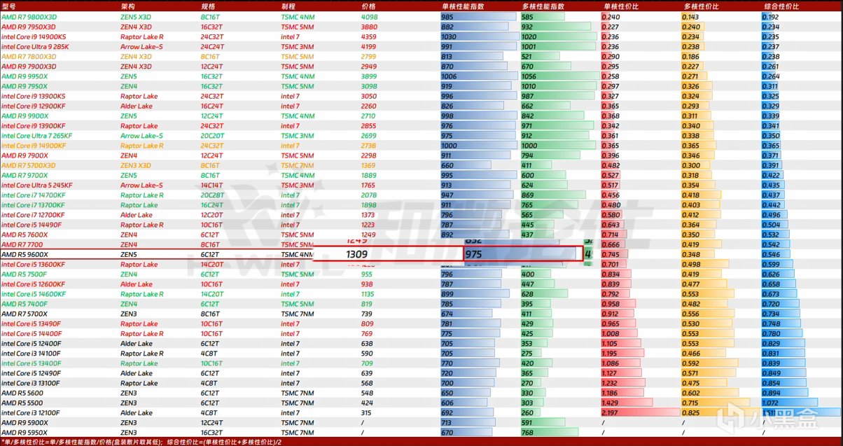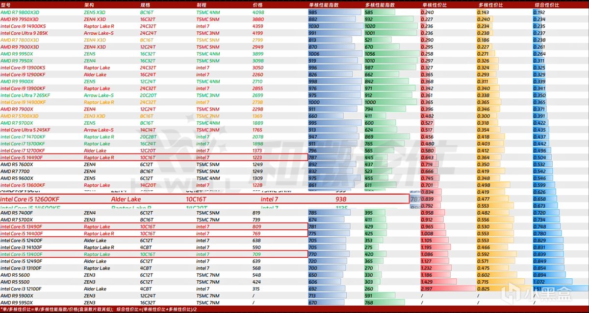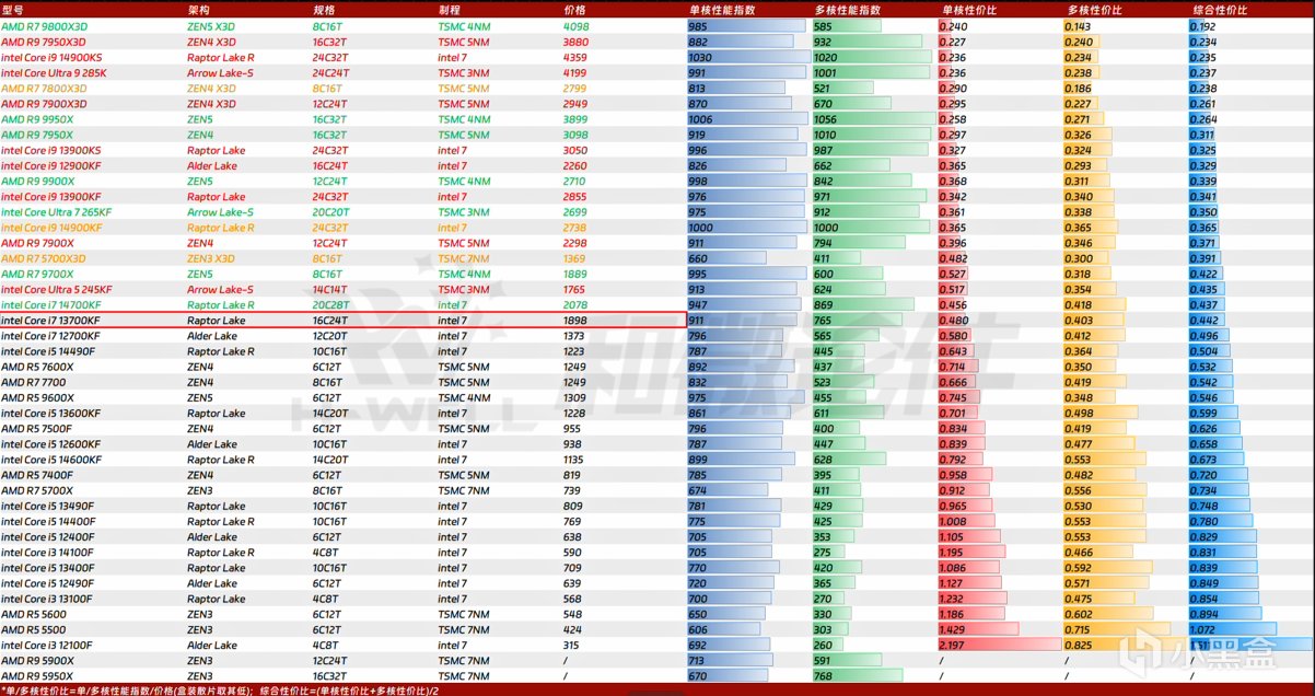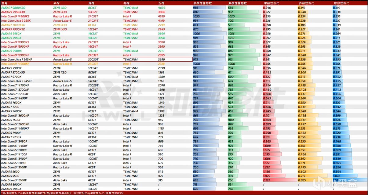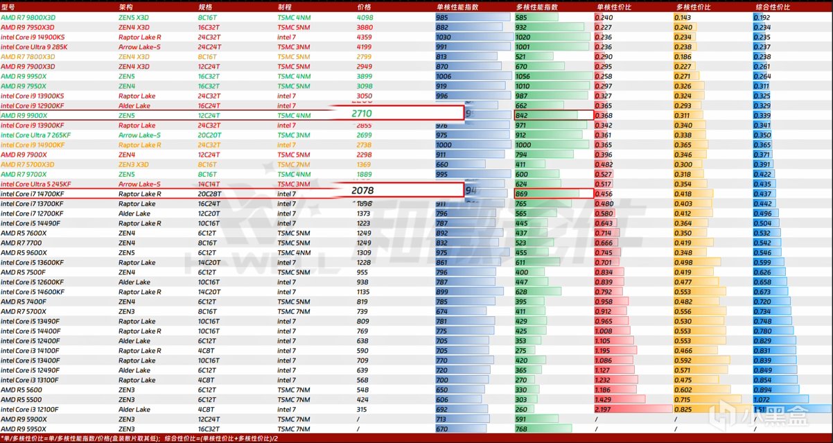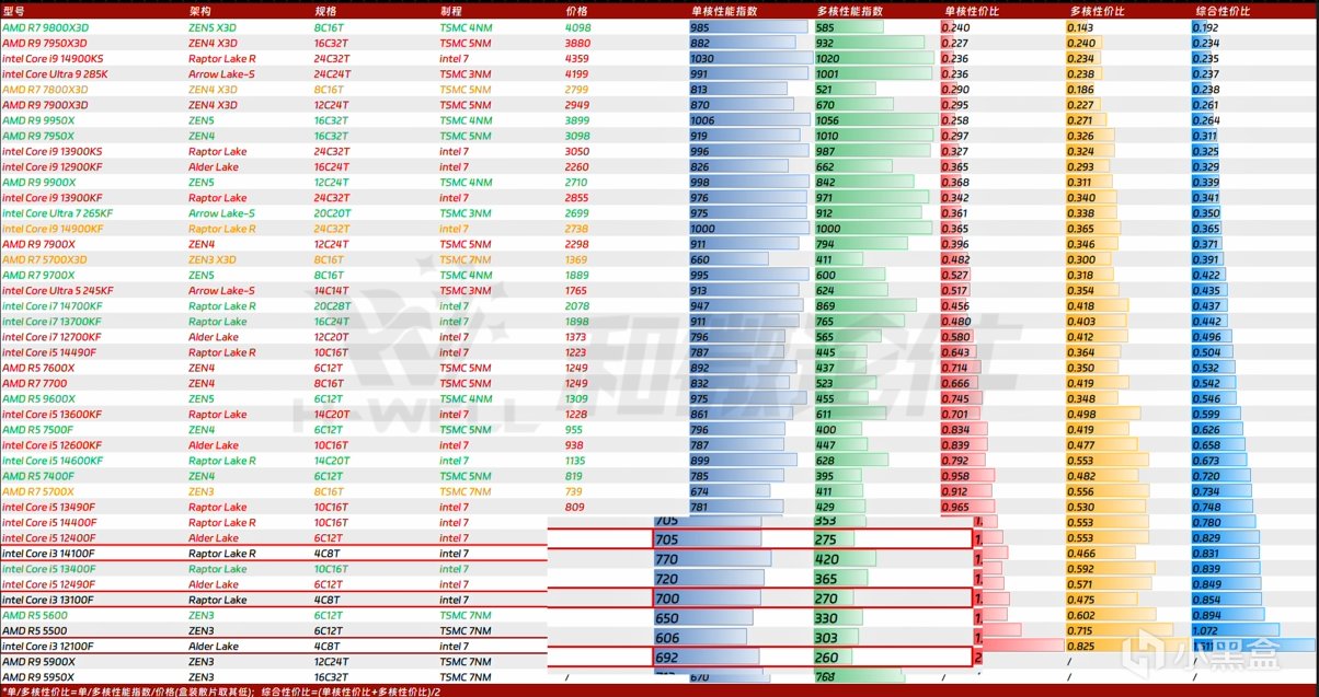 其他主流產品,我們就一起來細細梳理吧。這是綜合性價比排名圖,算法是前面的(單核性價比指數+多核性價比指數)/2,非常粗糙,但是沒關係,接下來我們一起使用人工冒泡排序法手法將它細化,一一糾察錯誤。性價比排名最低的,是來自AMD的9800X3D,因爲遊戲性能當世無敵,所以實際的性價比會比表格中高一點,價格方面,散片4100左右,相比上個月降低了300,如果你打算近期入手50系,我也不勸你等了,買了就買了吧,總體評價是 可以購買。